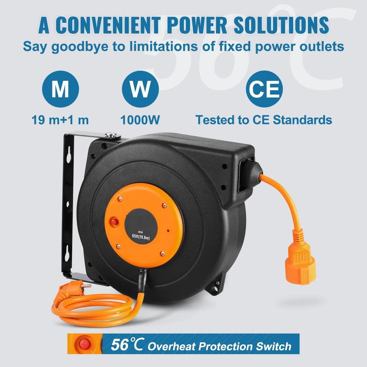 Prelungitor pe tambur retractabil, Fixare pe perete, max 1000 W, Suport pivotant, cablu 1.5 mmp, Lungime 19 m, Protectie supraincalzire