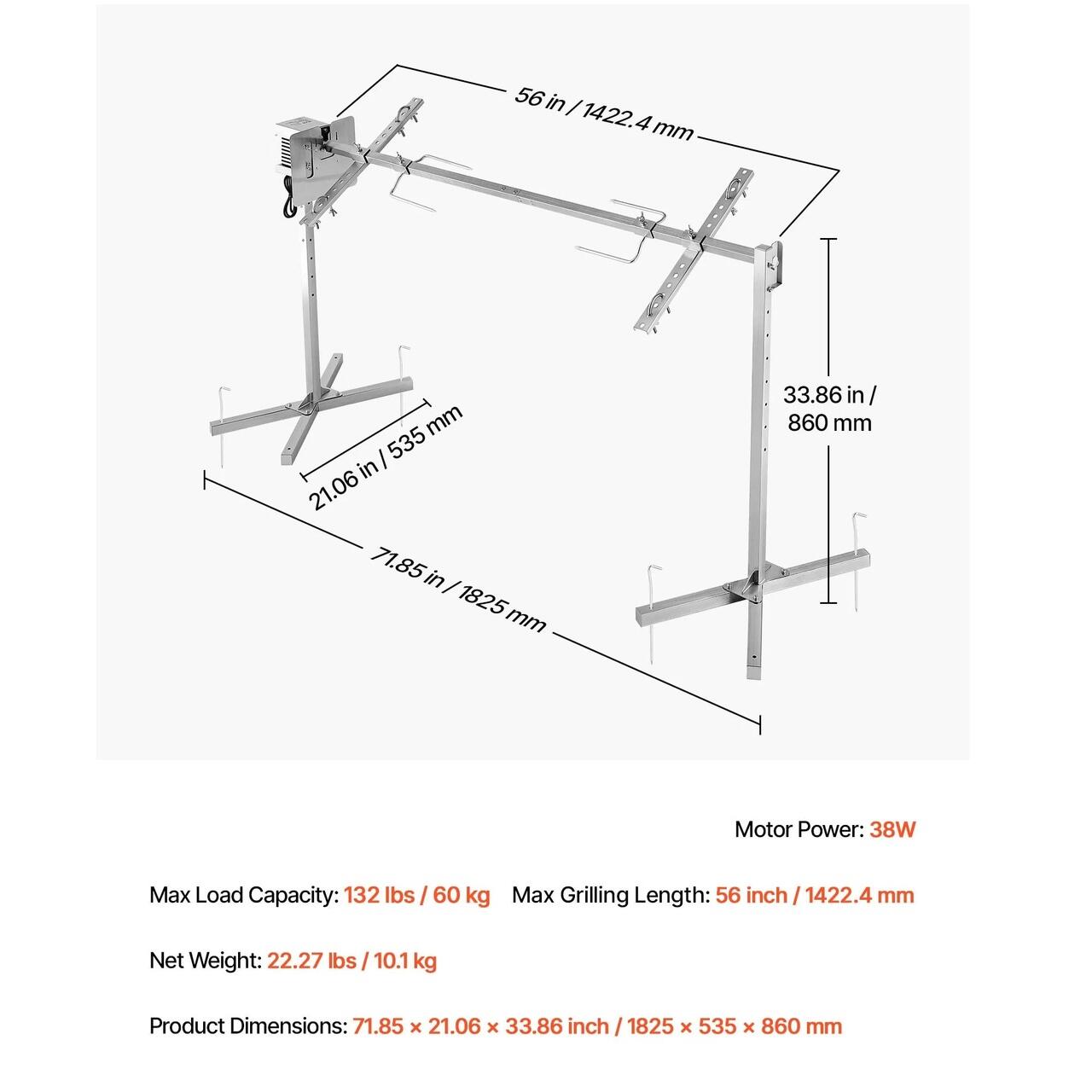 Capacitate mare: Conceput pentru a gestiona pana la 60 kg, cadrul acestui gratar cu rotisor de 56 inch/1422,4 mm poate gazdui porci, miei, curcani si multe altele. Ideal pentru a crea mese copioase, gatite uniform, care impresioneaza familia si prietenii la orice reuniune.