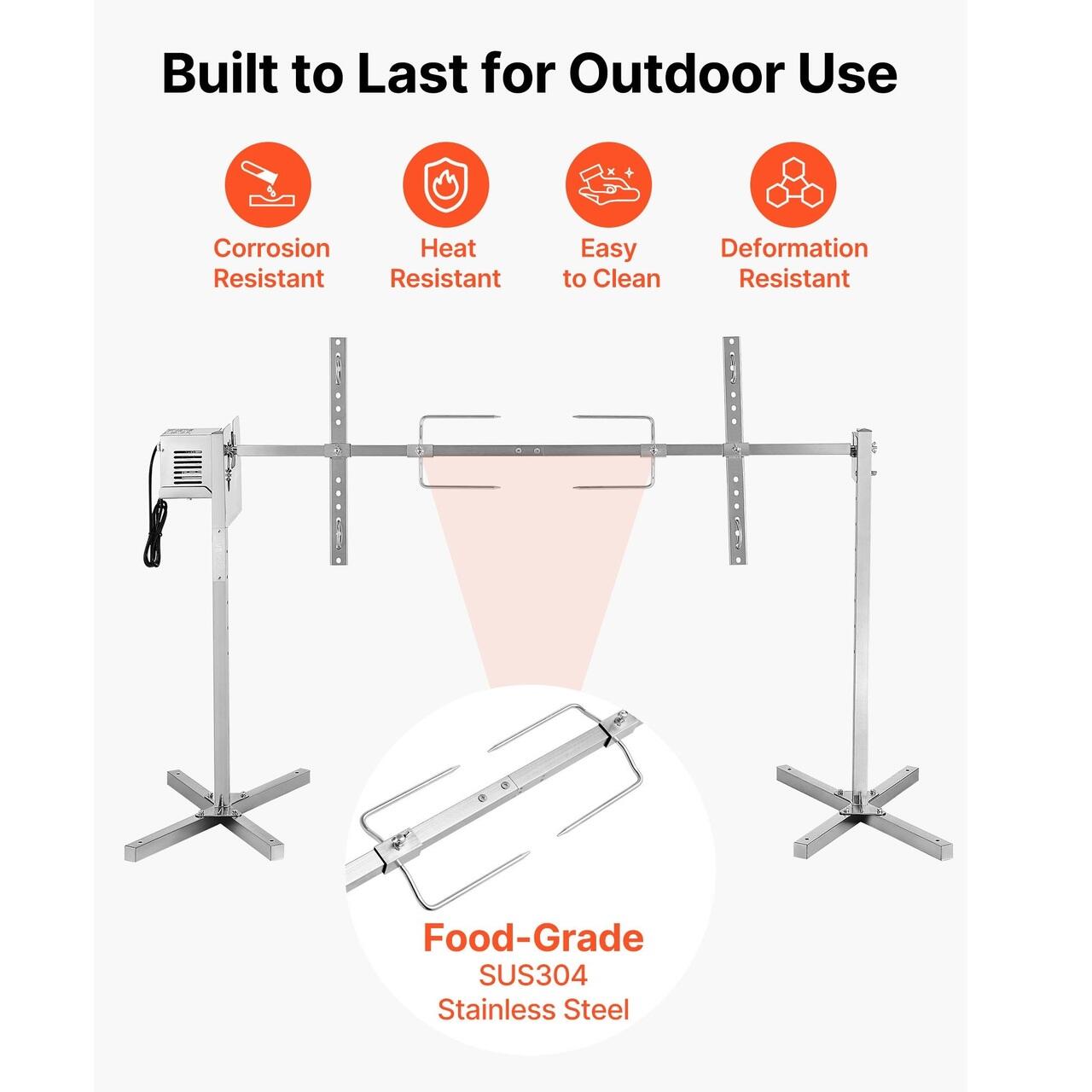 Constructie din otel inoxidabil: Fabricat din otel inoxidabil robust, acest kit de rotisor asigura rezistenta la rugina si curatare fara efort. Echipat cu furci SUS304 pentru contactul cu alimentele, gestioneaza gatitul intens in aer liber cu stabilitate si eficienta.