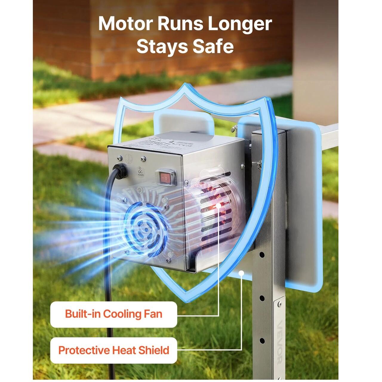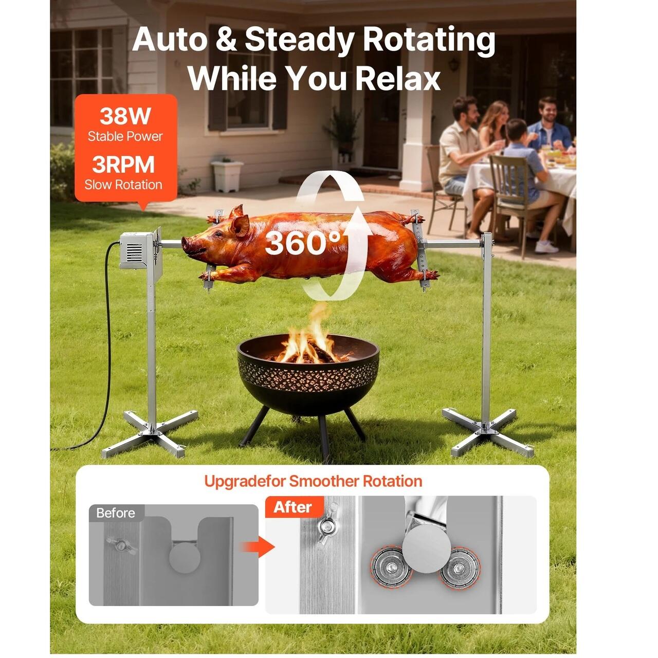 Rotatie lina la 360°: Bucurati-va de o rotatie lina cu acest kit de rotisor alimentat de un motor de 38 W la 3 RPM. Rulmentii dubli reduc solicitarea motorului, in timp ce ventilatorul de racire imbunatatit si capacul de protectie mentin unitatea in functiune eficienta pentru mese gatite uniform.