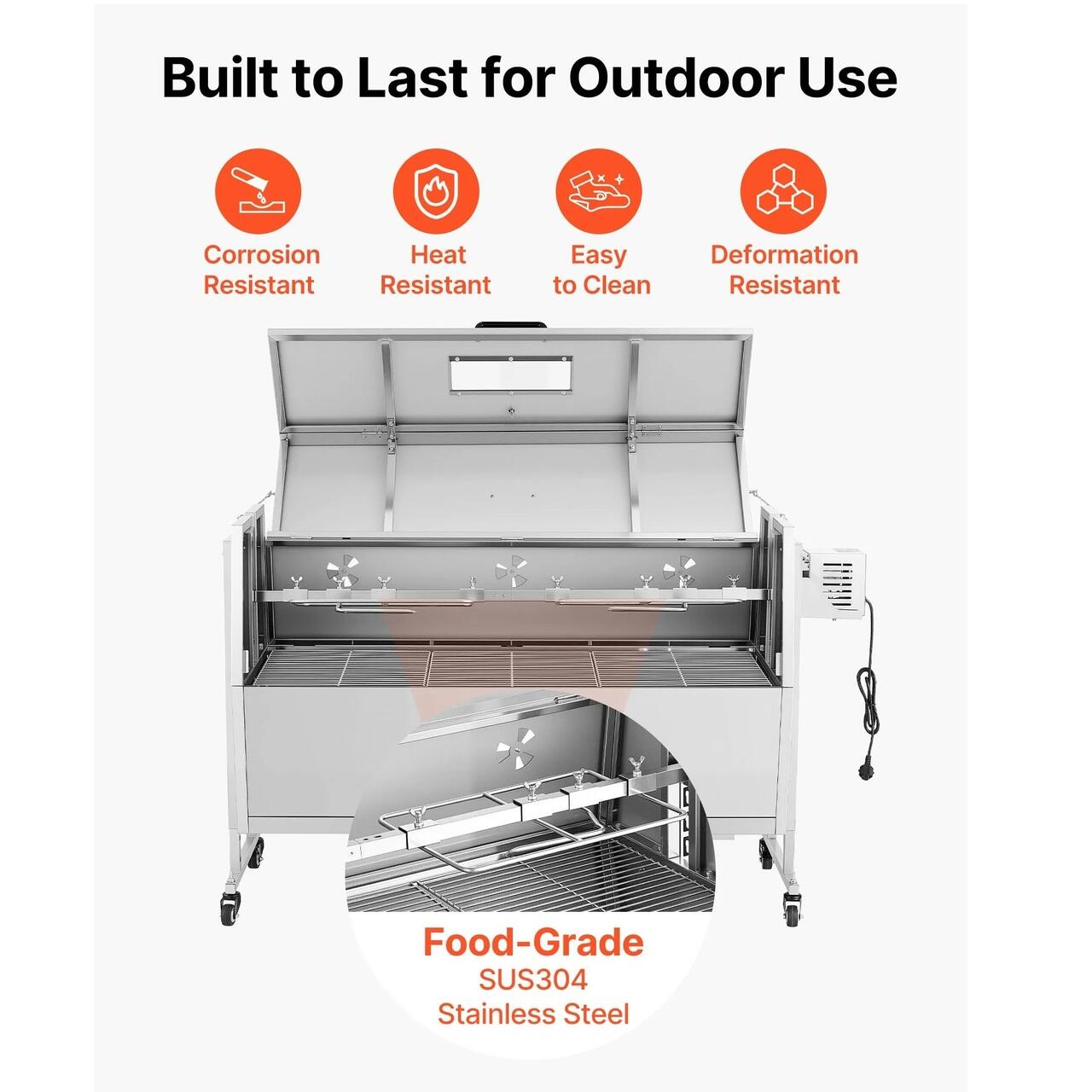 Rotire fara efort: Cu un motor de 38 W si o rotatie de 3 RPM, acest rotisor pentru porci foloseste rulmenti dubli pentru o miscare lina si constanta, reducand in acelasi timp sarcina motorului. Ventilatorul de racire imbunatatit asigura o performanta constanta fara supraincalzire.