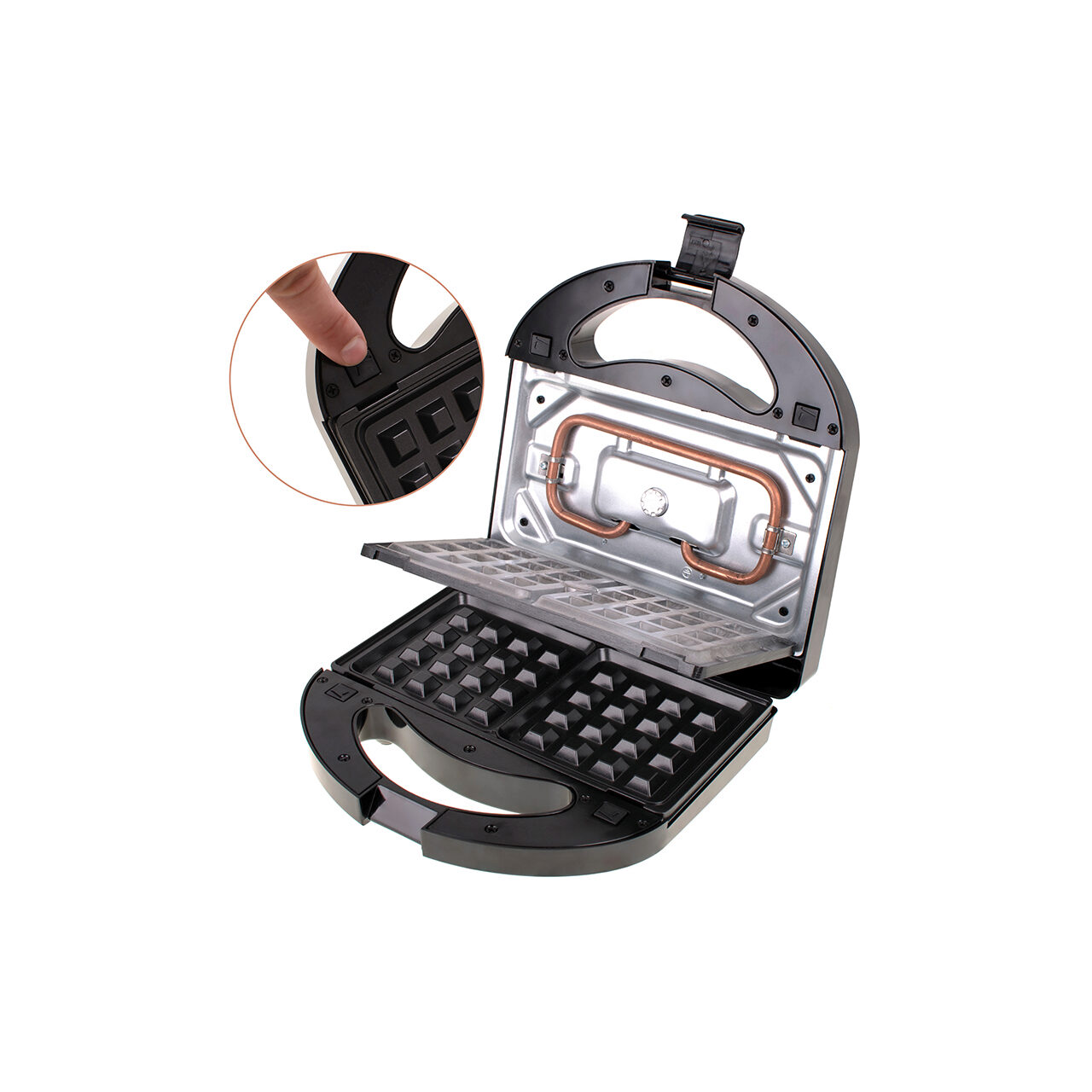 - Datorita celor trei plite inlocuibile, aparatul va permite sa pregatiti vafe crocante, sandvisuri delicioase, legume la gratar sau carne
