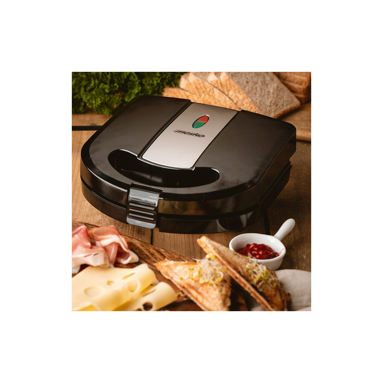 Placile pentru sandwich, gratar si vafe sunt foarte usor de inlocuit si au un strat antiaderent. Datorita acestui fapt, nici curatarea lor nu necesita mult efort, tot ce aveti nevoie este un prosop de hartie! Luminile de alimentare (rosu) si termostat (verde) de pe partea superioara a capacului prajitorului de paine indica faptul ca aparatul este gata de utilizare, ceea ce face ca functionarea prajitorului de paine sa fie extrem de intuitiva. Puterea maxima a dispozitivului de pana la 1000 W va permite sa incalziti rapid dispozitivul si in cateva momente puteti pregati legume sau carne la gratar pentru cina. Manerul termoizolant si carcasa protejeaza impotriva arsurilor. Pur si simplu bateti legumele sau ingredientele preferate pentru paine prajita si va puteti bucura de gustarea preferata in cateva secunde.