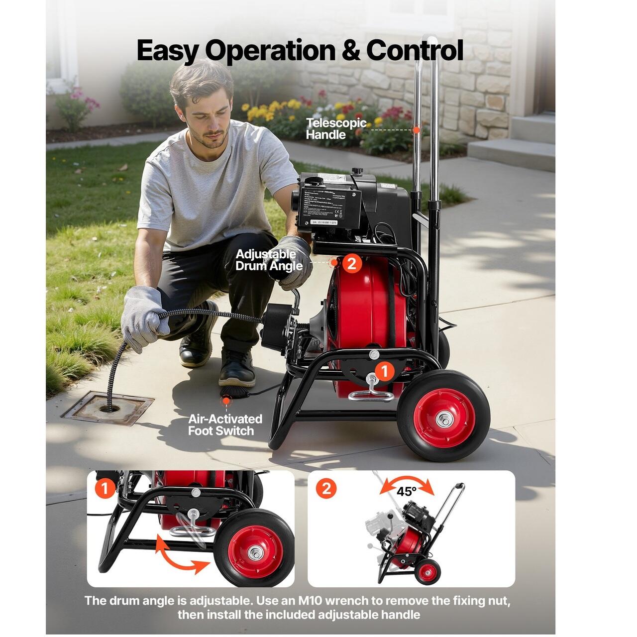 Mai multe modele imbunatatite: Unghiul reglabil al tamburului va permite sa aliniati tamburul cu intrarea in teava, asigurand o alimentare mai lina a cablului si o operare mai usoara in diferite scenarii. Manerul telescopic cu 2 niveluri ofera o utilizare mai ergonomica si faciliteaza transportul si depozitarea.