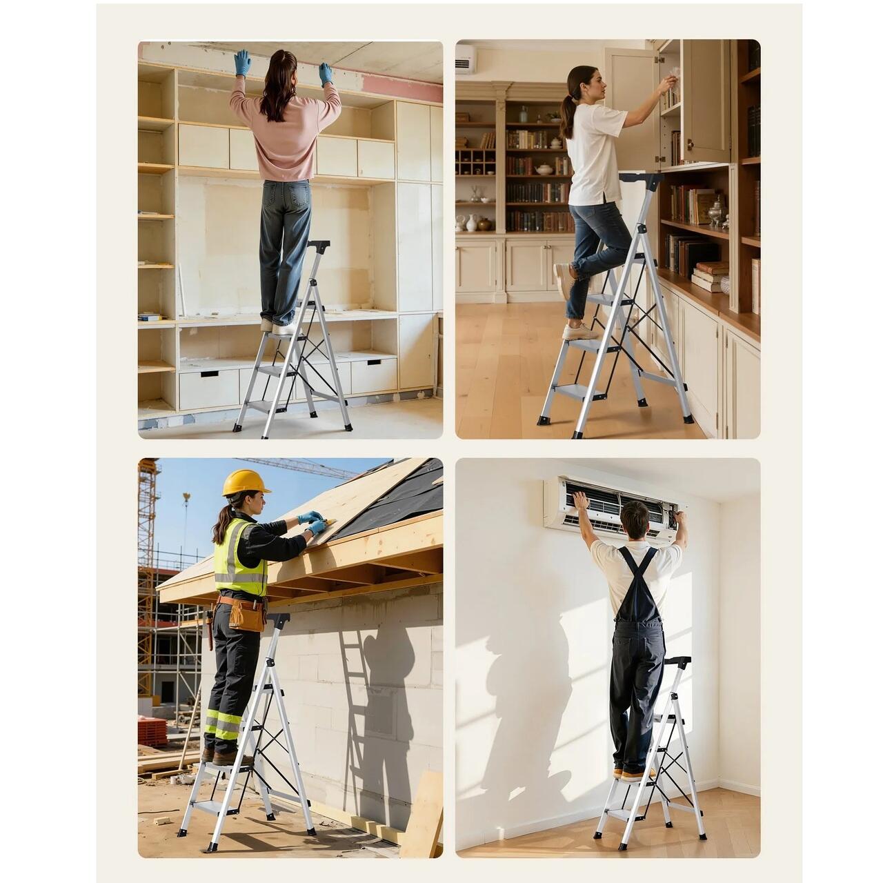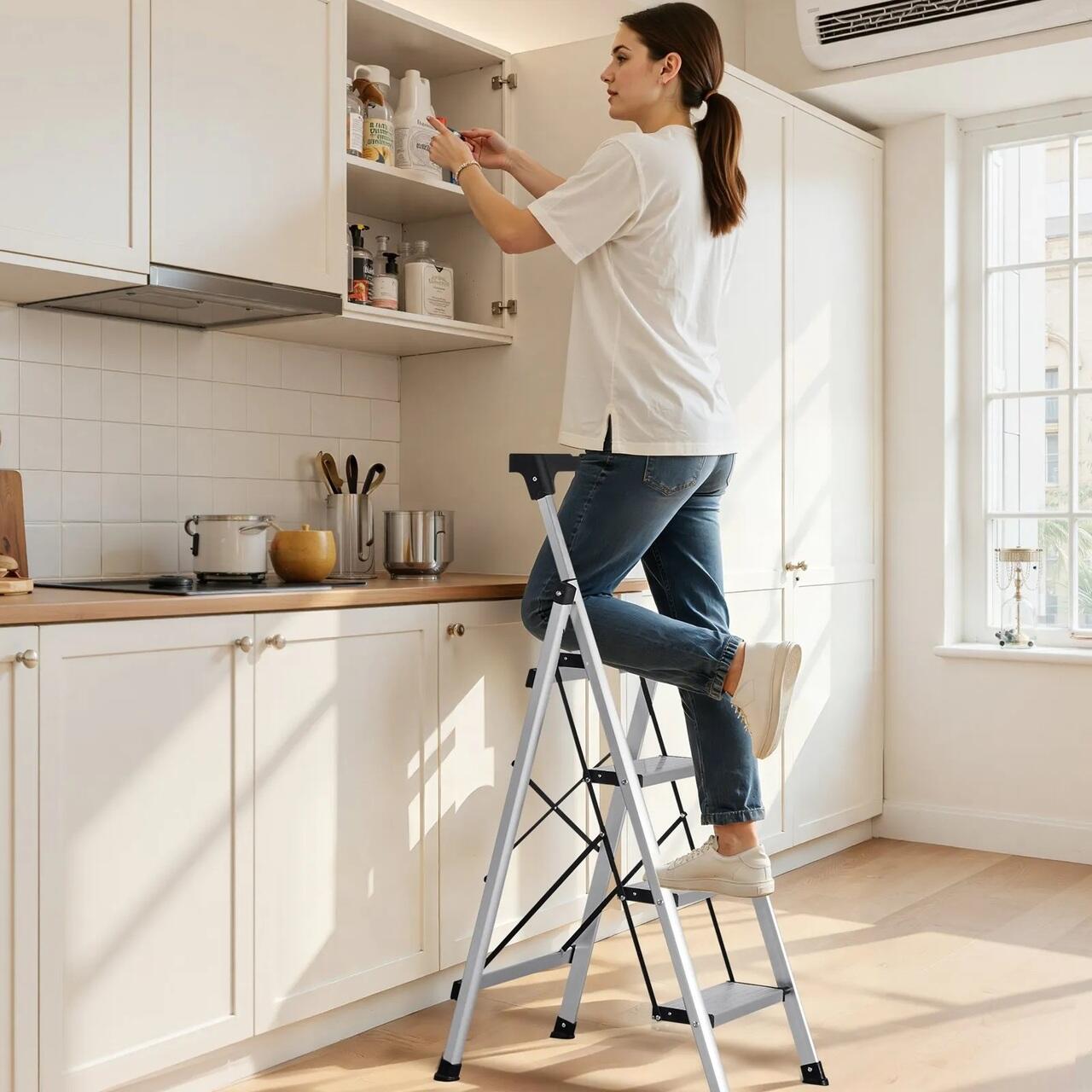 Pliabil si economiseste spatiu: Grosimea pliata se afla subtire in spatele usilor, dulapurilor sau colturilor, mentinand scara pregatita, dar discreta. Acest scaunel ofera un design antiderapant si sigur pentru utilizare cu incredere.