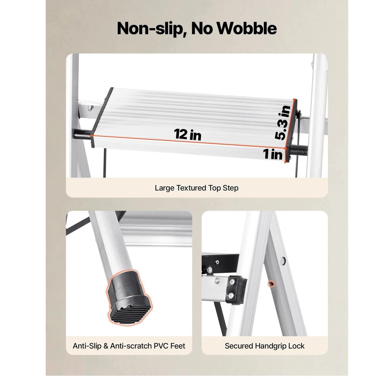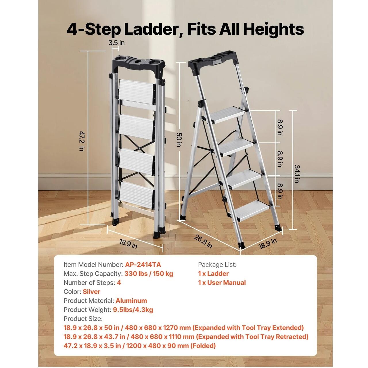 Elevatie completa in 4 trepte: Dimensiunea extinsa de 47,9 x 26,7 x 50 in ofera o acoperire inalta si stabila pentru dulapuri, poduri si decor, fara a intinde picioarele in mod periculos, iar dimensiunea pliata de 47,2 x 18,9 x 3,5 in ofera o depozitare convenabila si economie de spatiu.