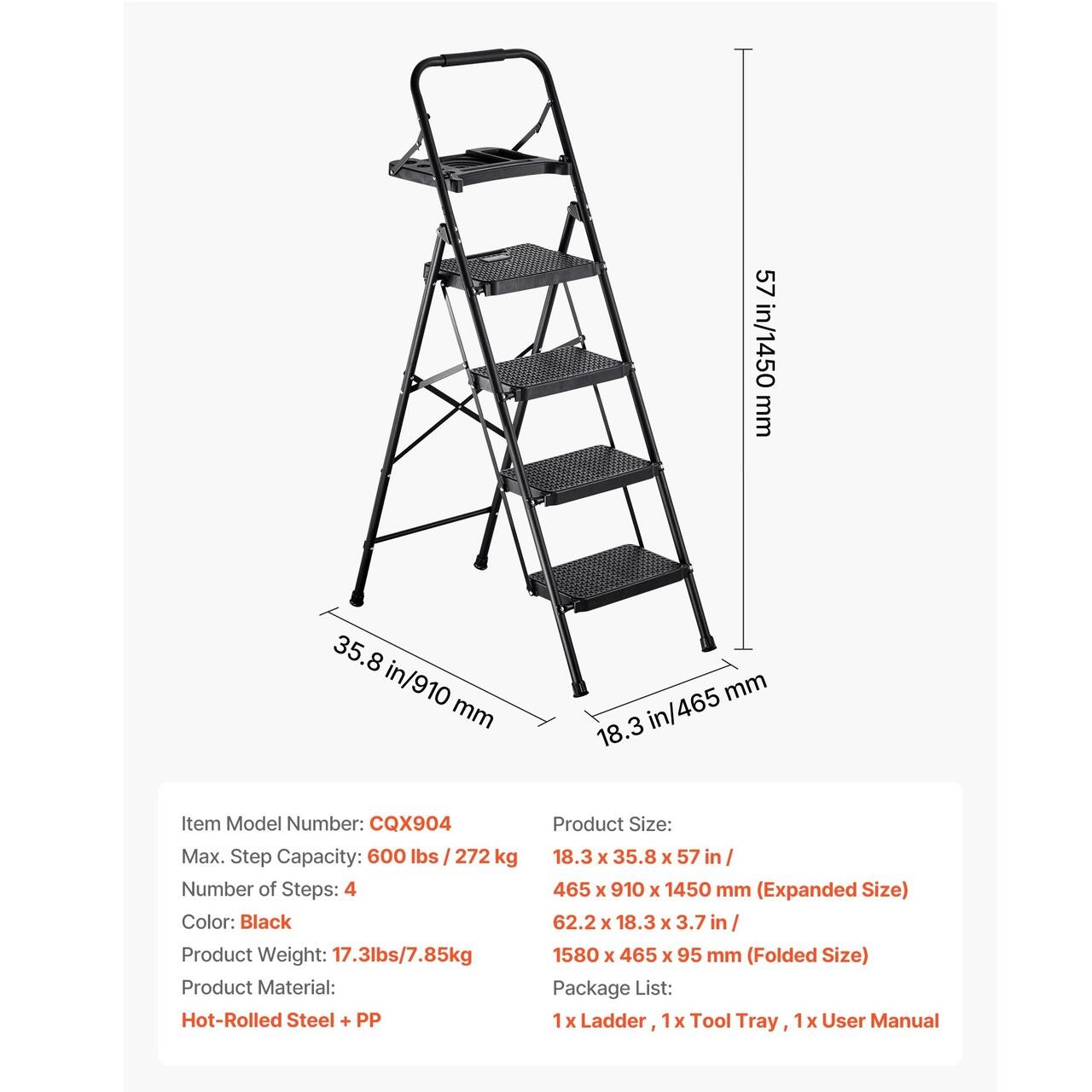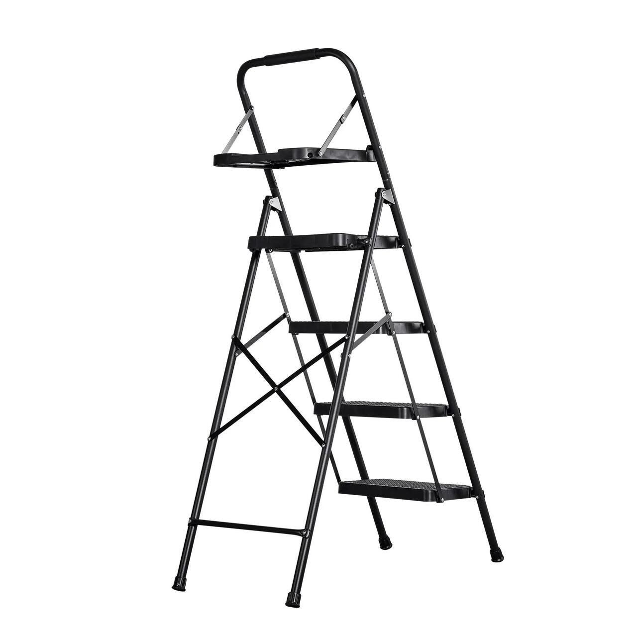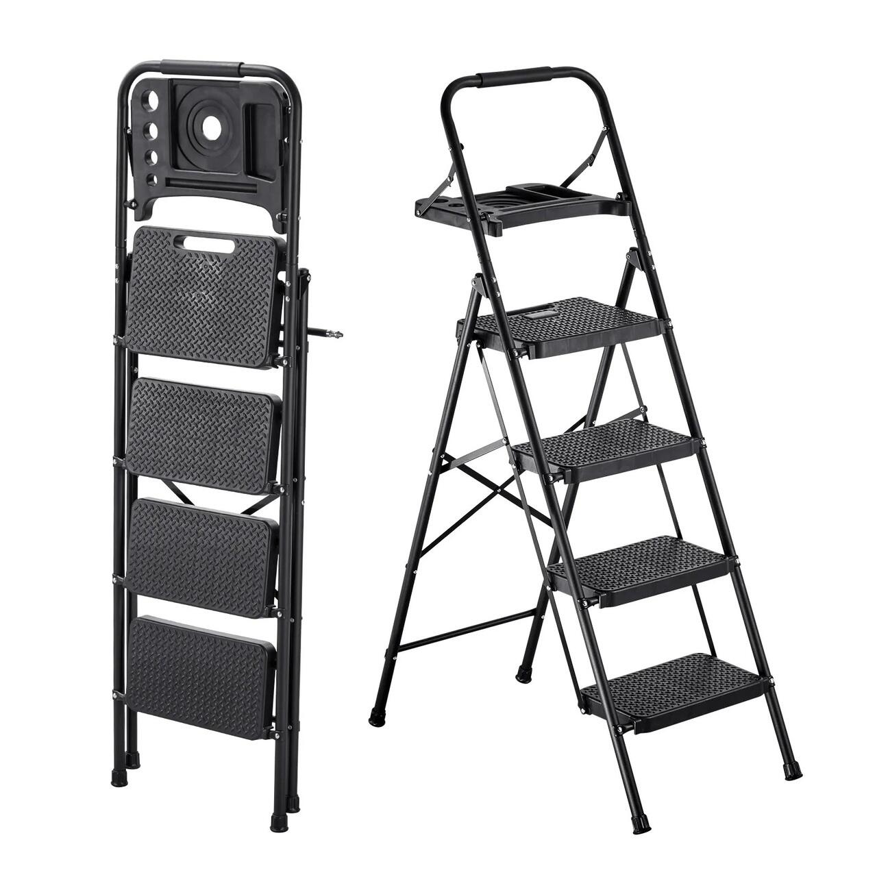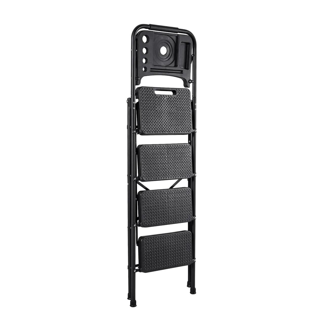 Scara pliabila cu 4 x Trepte Anti-derapante, Capacitate 272 kg, Otel, Tava scule, Negru