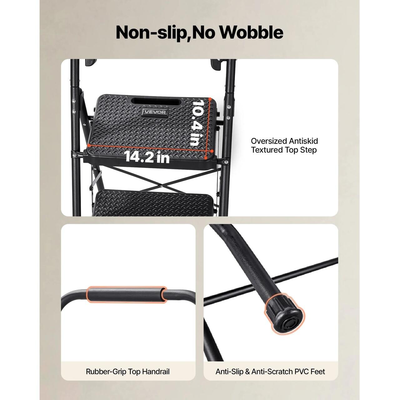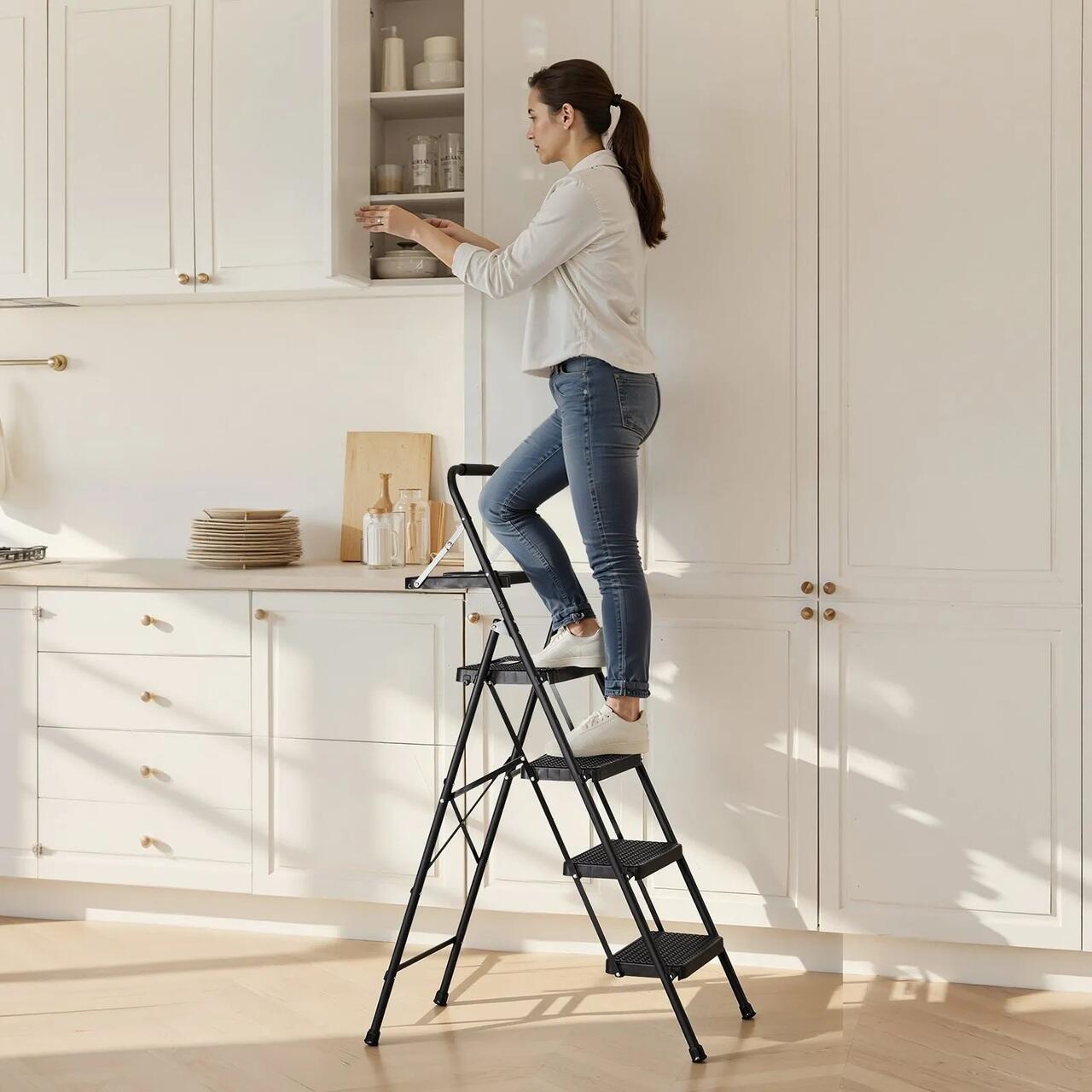 Pliabil si economiseste spatiu: Grosimea pliata se afla subtire in spatele usilor, dulapurilor sau colturilor, mentinand scara pregatita, dar discreta. Acest scaunel ofera un design antiderapant si sigur pentru utilizare cu incredere.