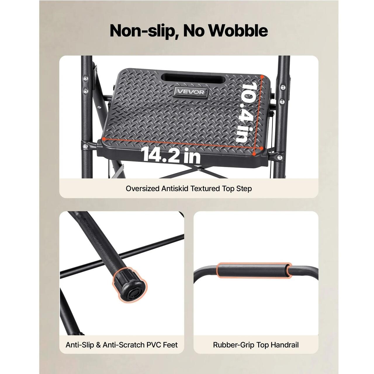 Siguranta si stabilitate: Treapta superioara texturata, marita, ofera o pozitie stabila. Picioarele late acoperite cu PVC ajuta la reducerea urmelor pe podea si a miscarilor nedorite. Balustrada superioara captusita cu cauciuc ofera un suport sigur si confortabil pentru o utilizare zilnica sigura.