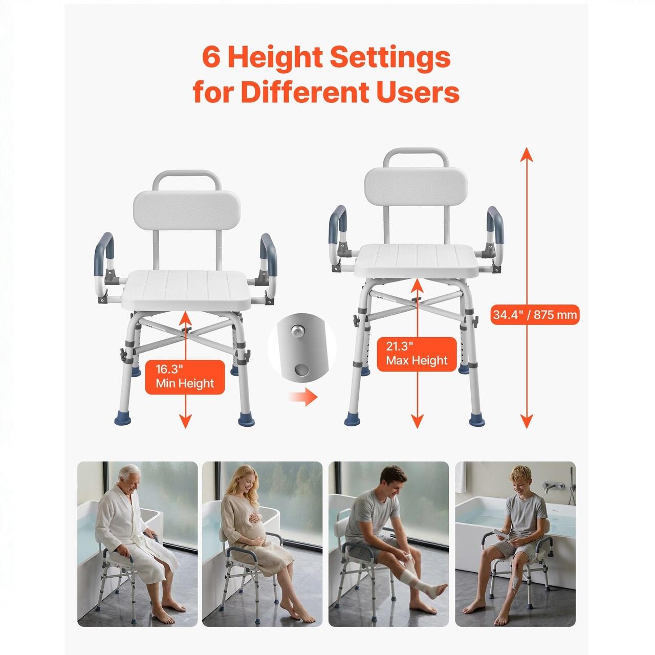 Inaltime reglabila: Banca noastra de transfer pentru cada ofera reglarea inaltimii pe 6 niveluri prin apasarea unui buton, pentru o instalare rapida si usoara. Inaltimea de la scaun la podea variaza de la 415 la 540 mm, ceea ce o face potrivita pentru utilizarea in diverse medii de baie.