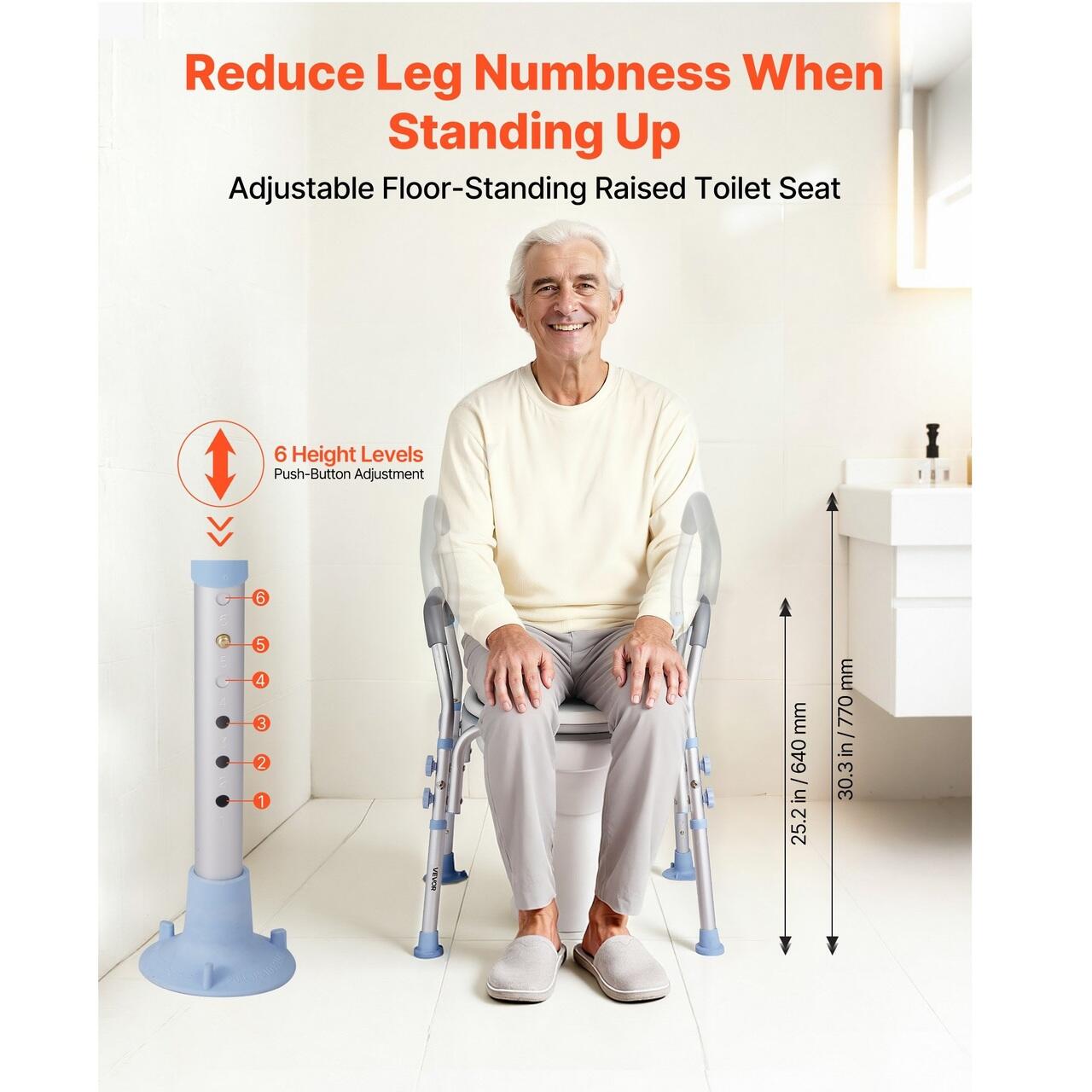 Ajutor reglabil pentru toaletă: Scaunul nostru de toaletă ridicat are șase setări de înălțime pentru ajustare de la 640–770 mm. Este ideal pentru femeile însărcinate, seniorii, pacienții și persoanele cu dizabilități, reducând presiunea asupra șoldurilor, genunchilor, picioarelor și tendoanelor.