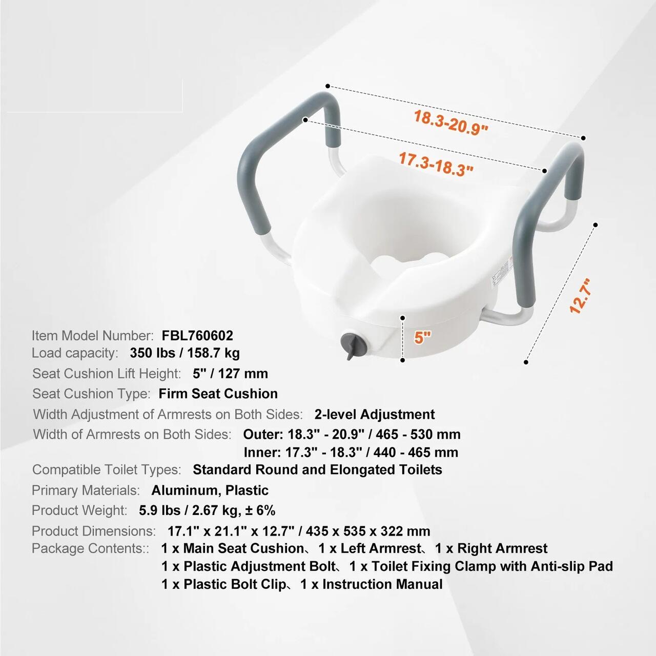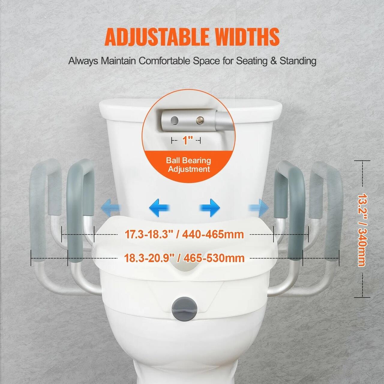 Materiale si constructie robuste: Construit in principal din aluminiu si plastic de inalta rezistenta, capacul de toaleta elevat este durabil si poate suporta pana la 167 kg, asigurand ca persoanele de diferite forme si greutati corporale il pot utiliza cu incredere. De asemenea, este usor de curatat in intregime.