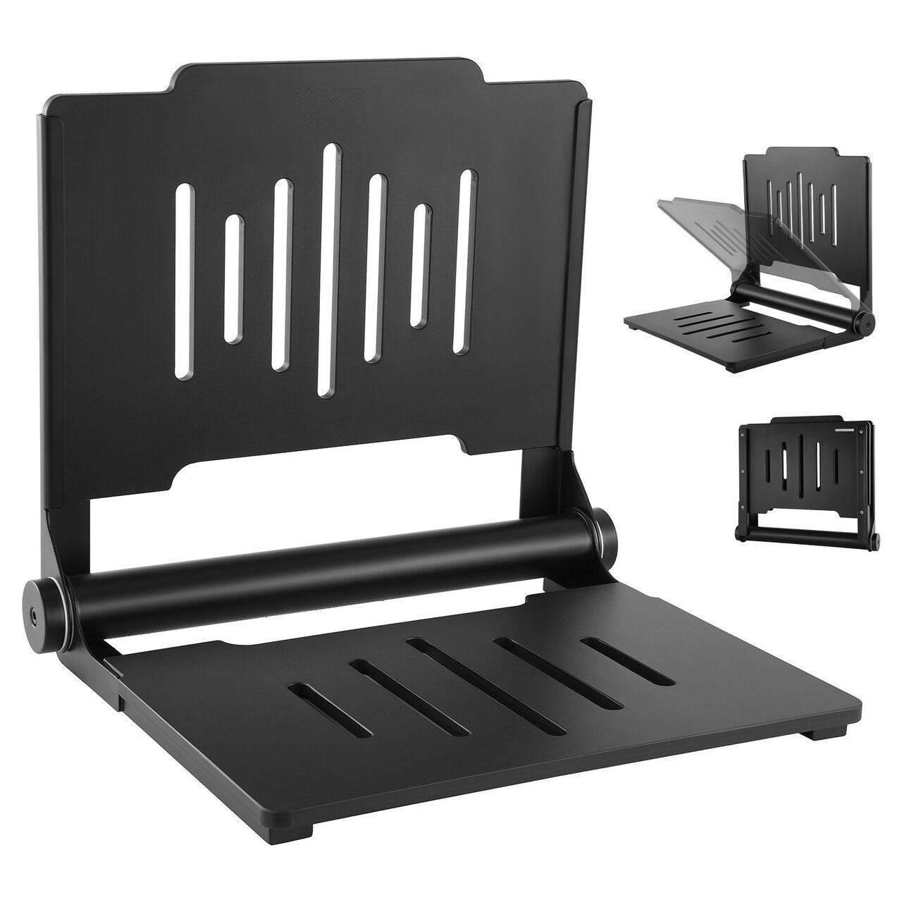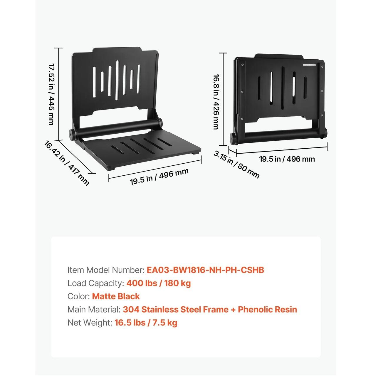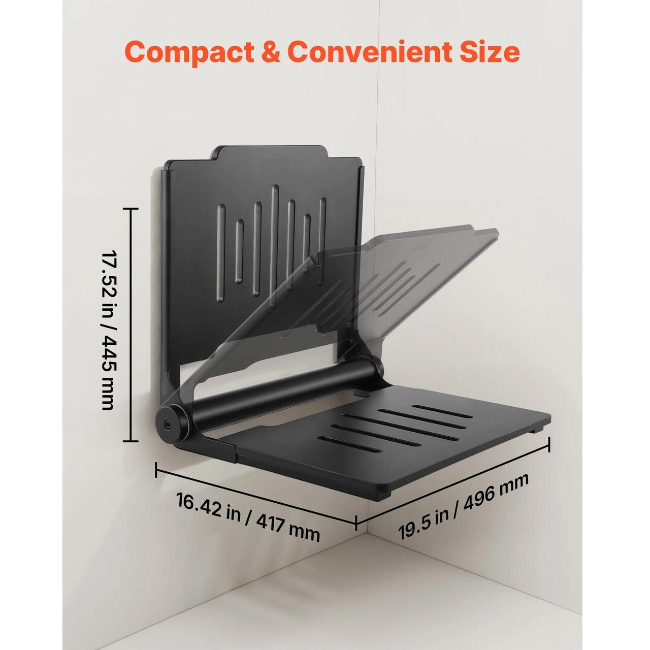 Scaun dus pliabil, montaj perete, Negru, Inox/PP, max 180 kg, dimensiuni deschis 496 x 417 x 445 mm