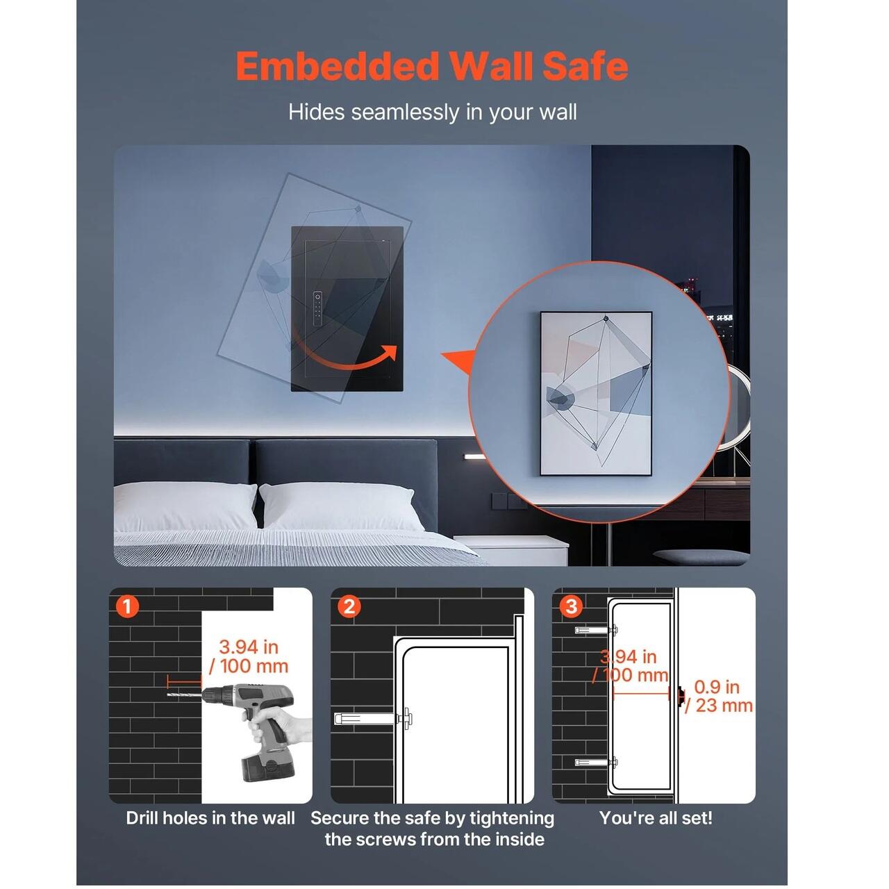 Design incastrat in perete: Acest seif ascuns in perete se potriveste perfect in perete, oferind o ascundere maxima. Ideal pentru camere de zi, dormitoare sau birouri, se integreaza fara efort in spatiul dvs., pastrand in acelasi timp obiectele de valoare ascunse in siguranta.