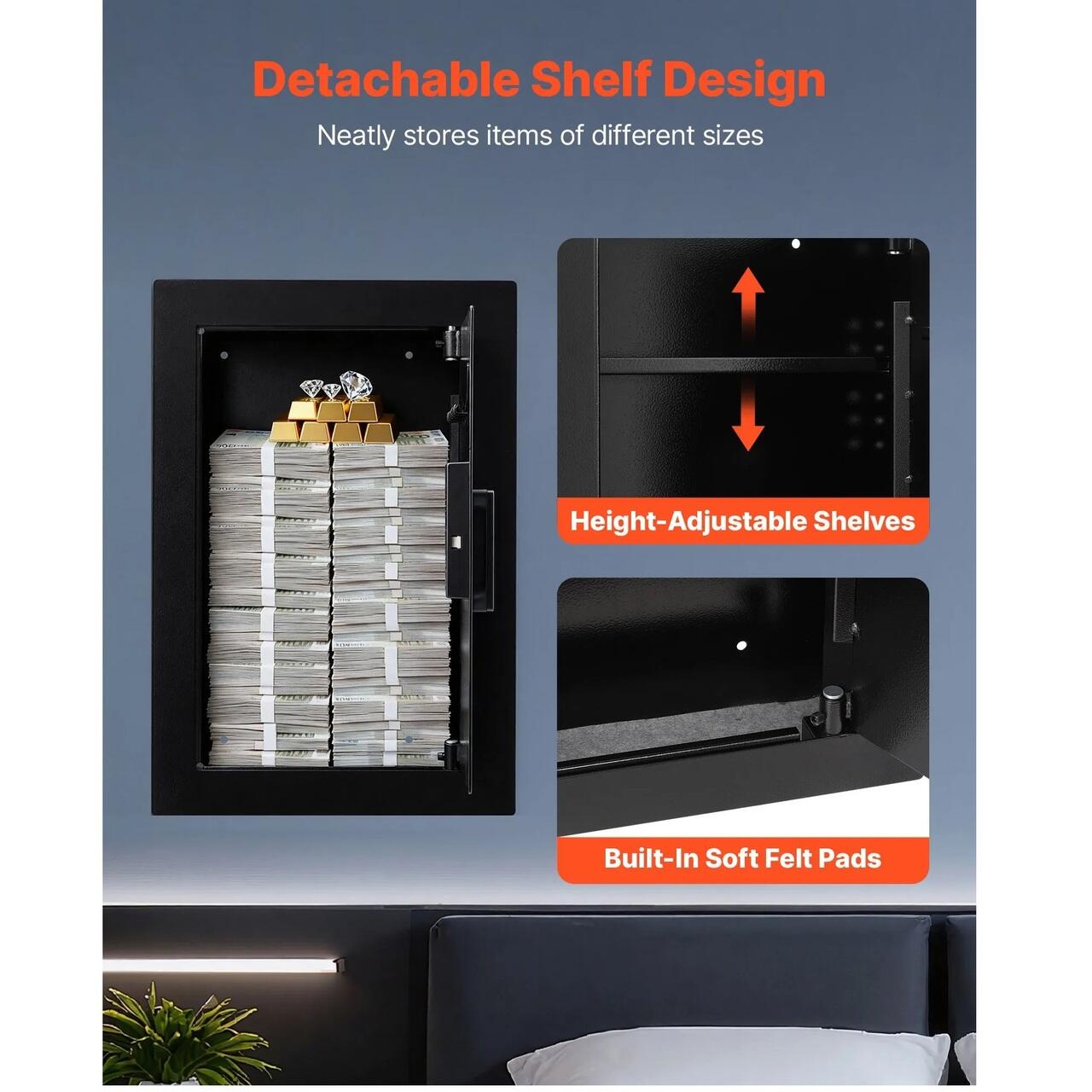 Raft reglabil: Echipat cu rafturi detasabile, acest seif de perete va permite sa personalizati spatiul interior pentru obiecte de diferite dimensiuni. Pernutele moi din fetru incorporate ofera protectie suplimentara, evitand zgarieturile si deteriorarea obiectelor de valoare.
