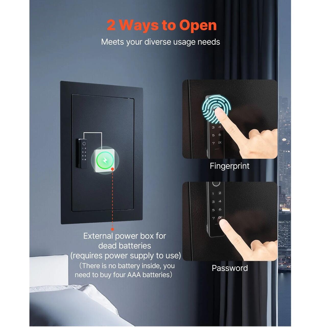 Optiuni multiple de deblocare: Seiful nostru de perete dispune de acces prin parola si amprenta pentru utilizarea zilnica. Daca cheia este pierduta sau bateria se descarca, o cutie de alimentare externa permite deblocarea de urgenta (necesita alimentare), asigurand acces rapid la obiectele de valoare.