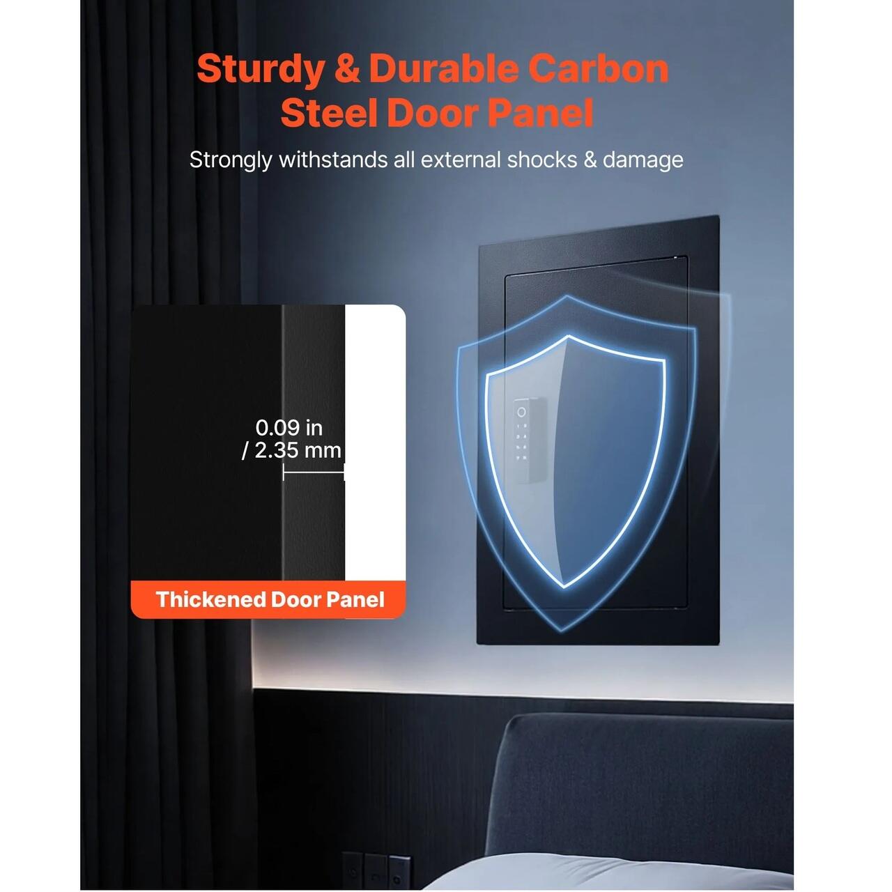 Durabil si rezistent: Fabricat din otel carbon de inalta rezistenta de 2,35 mm (0,09 in), acest seif incastrat in perete ofera o rezistenta excelenta la presiune si impact. Rezista eficient la lovituri accidentale sau incercari fortate, oferind protectie pentru obiectele de valoare din studiu.