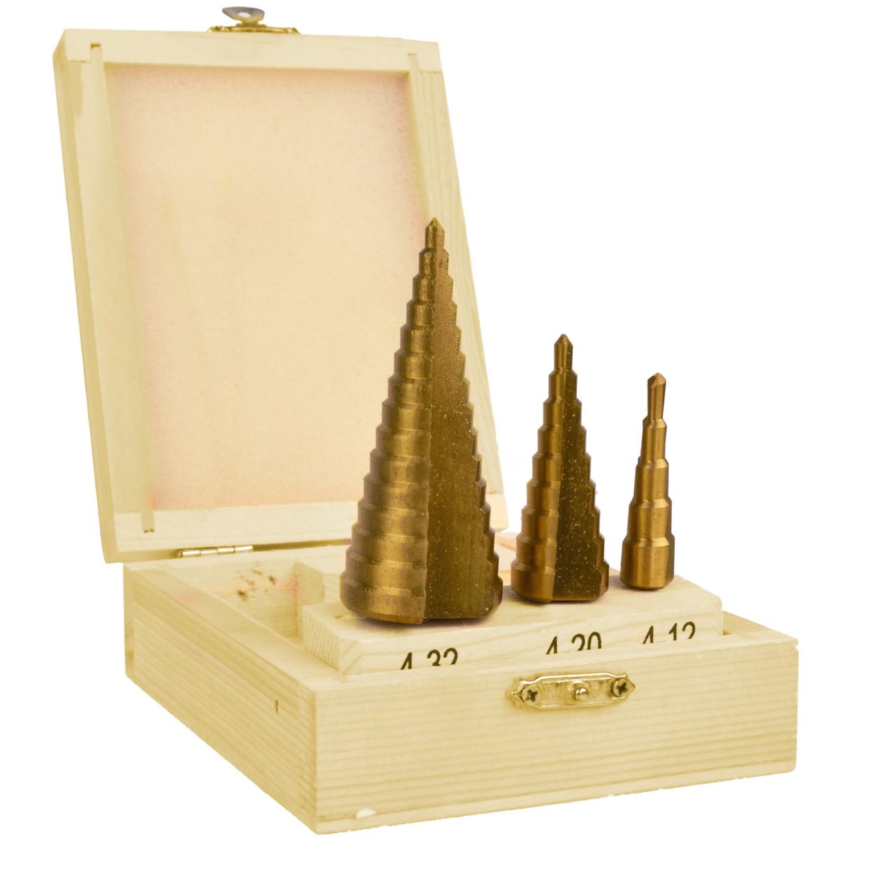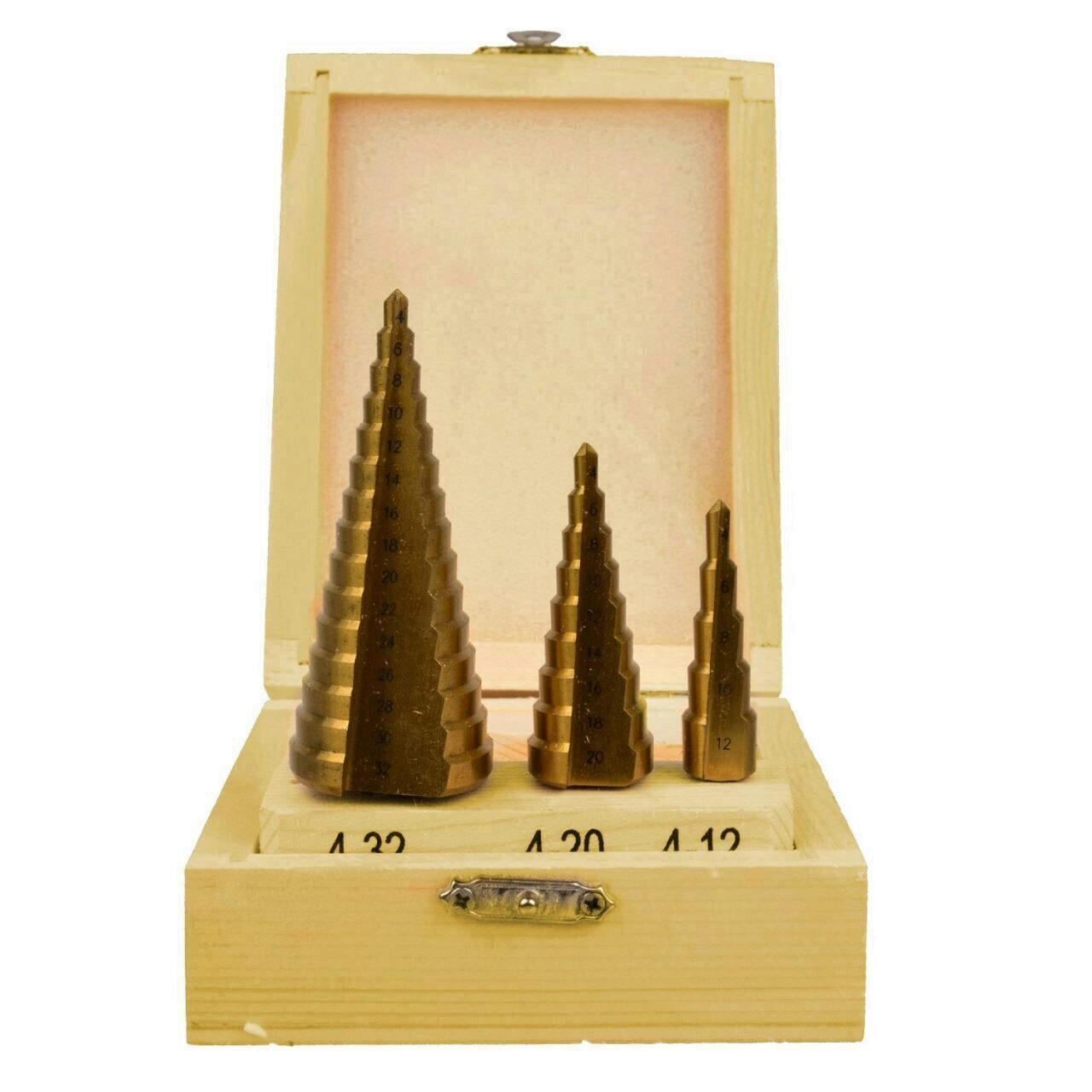Set 3 burghie in trepte Geko G38502, 4-12, 4-20, 4-32 mm, HSS, acoperite cu titan
