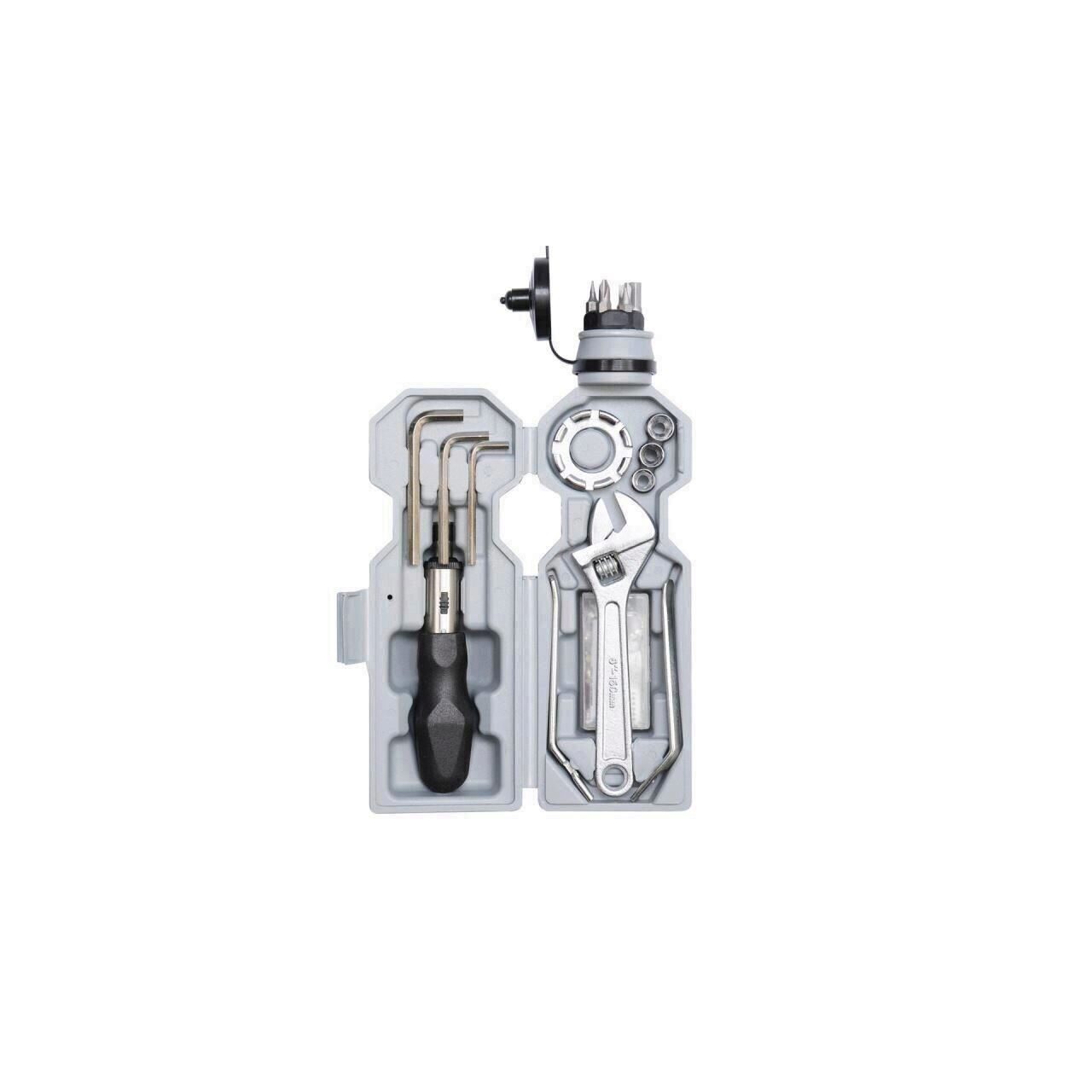 Set practic de instrumente de bază pentru biciclete plasate cutie in forma de sticla.