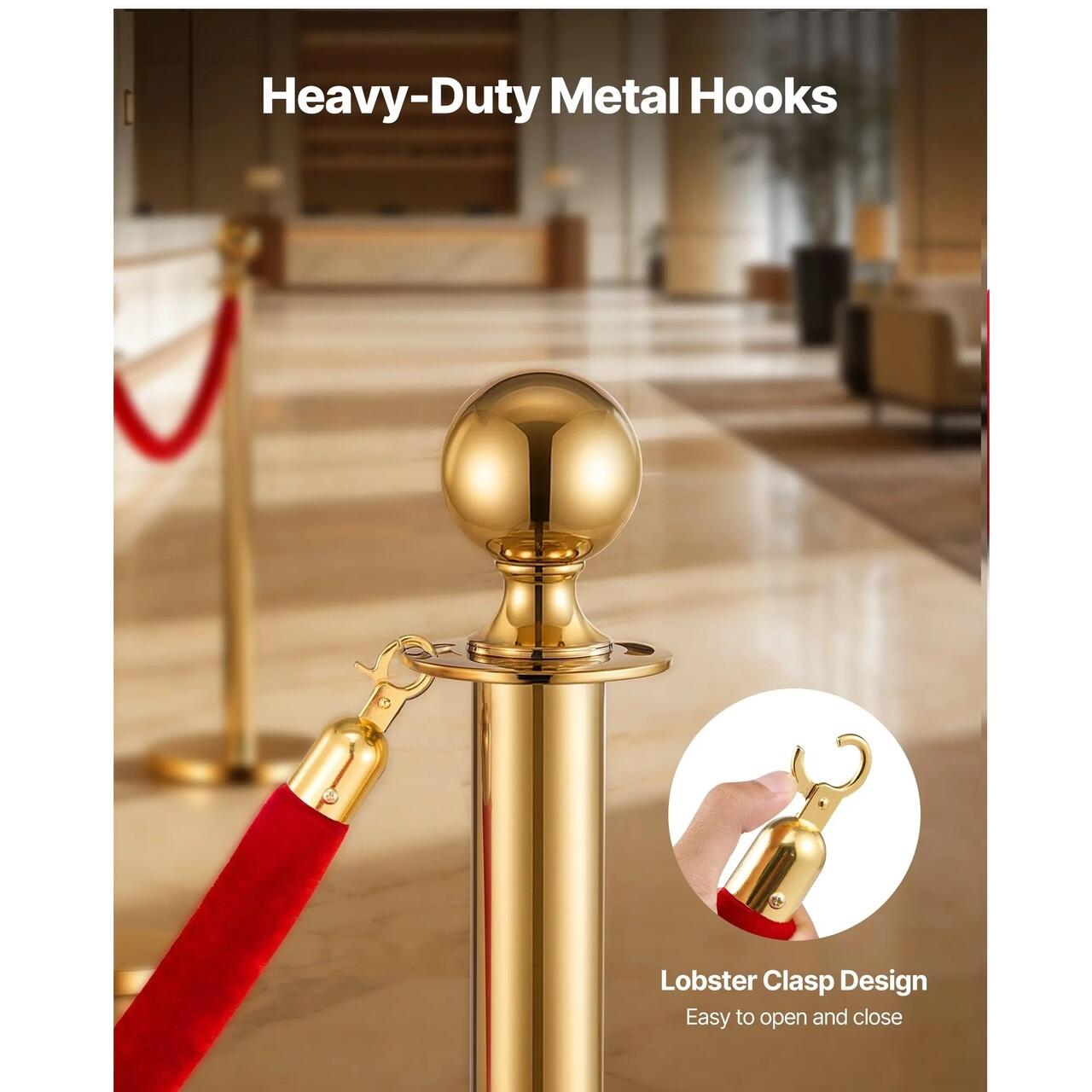 Carlige metalice rezistente: Fiecare capat al franghiei de catifea este prevazut cu o incuietoare tip homar din metal lustruit, care se deschide si se inchide usor, blocandu-se ferm pe inelele stalpilor.