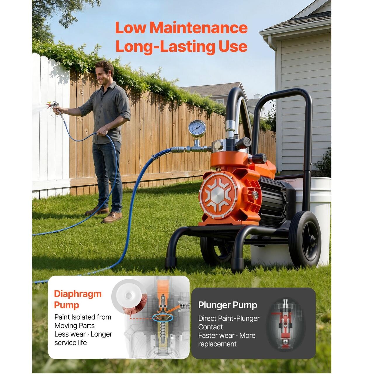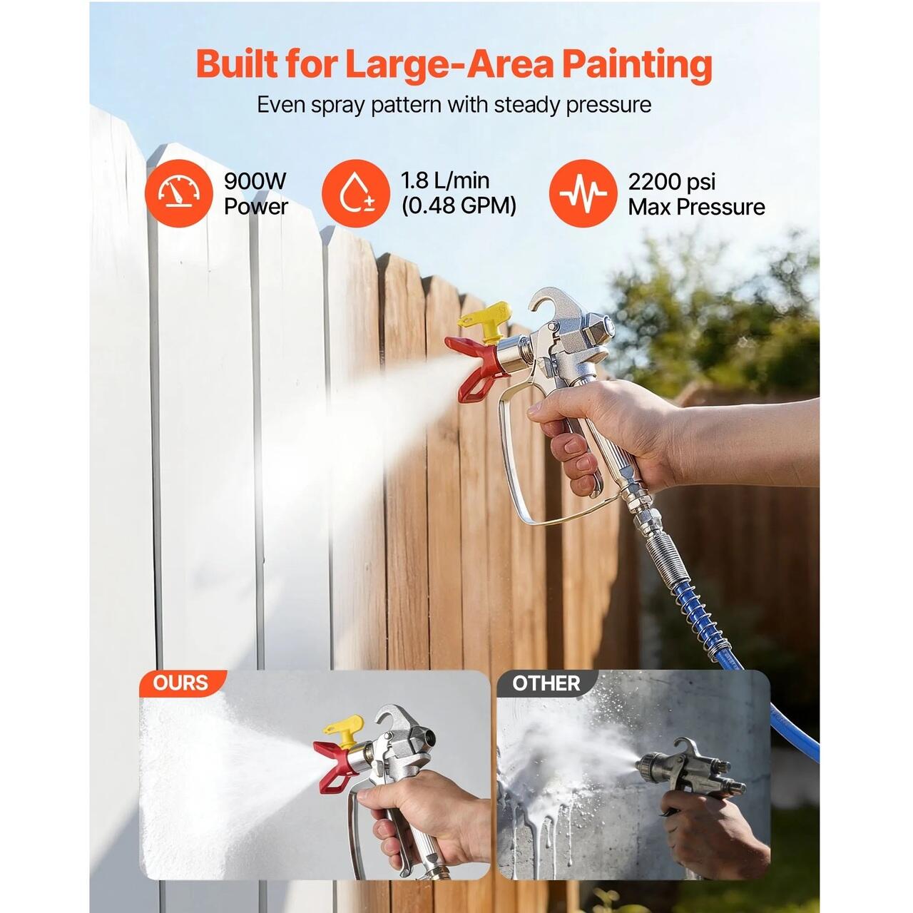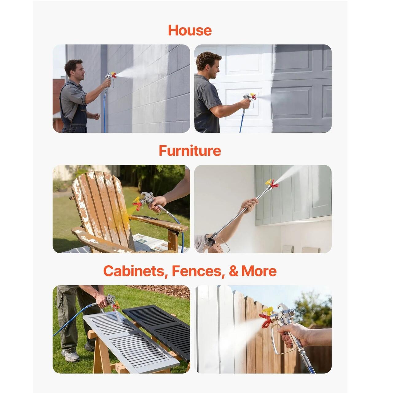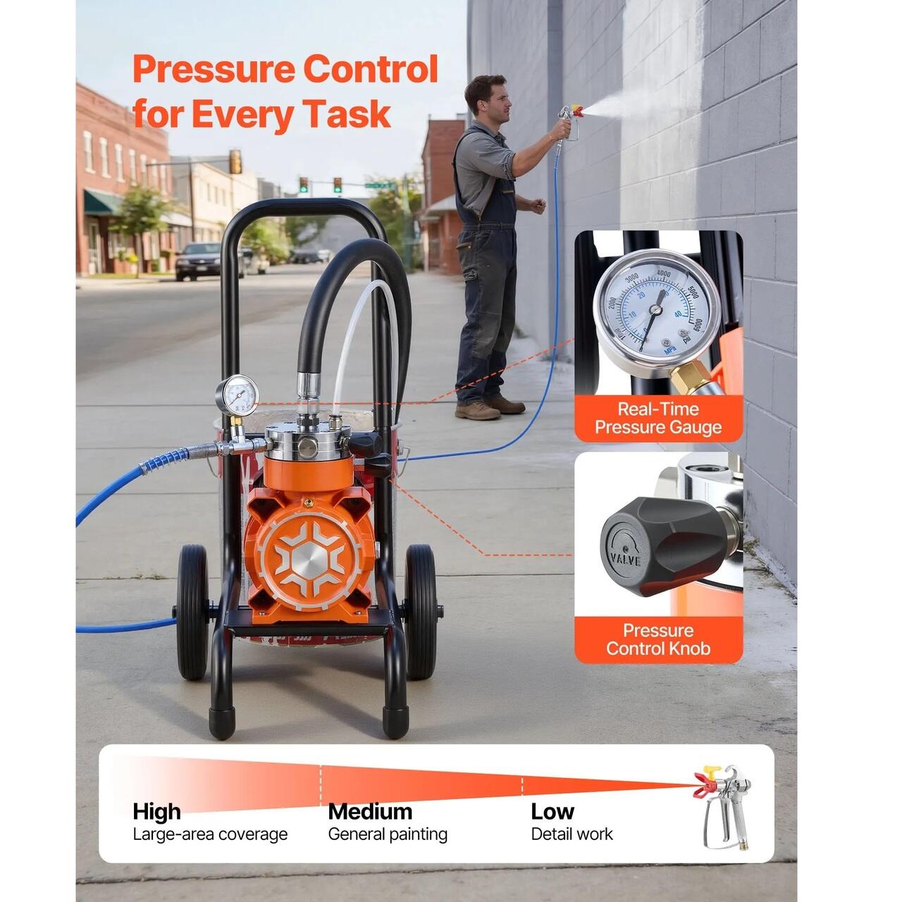 Construit pentru lucrari zilnice de renovare: Conceput pentru proiecte de renovare si revopsire, acest pulverizator de vopsea airless cu carucior ofera un randament constant si o acoperire uniforma pe pereti, garduri, dulapuri si multe altele, facand proiectele de vopsire mai usoare si mai eficiente.