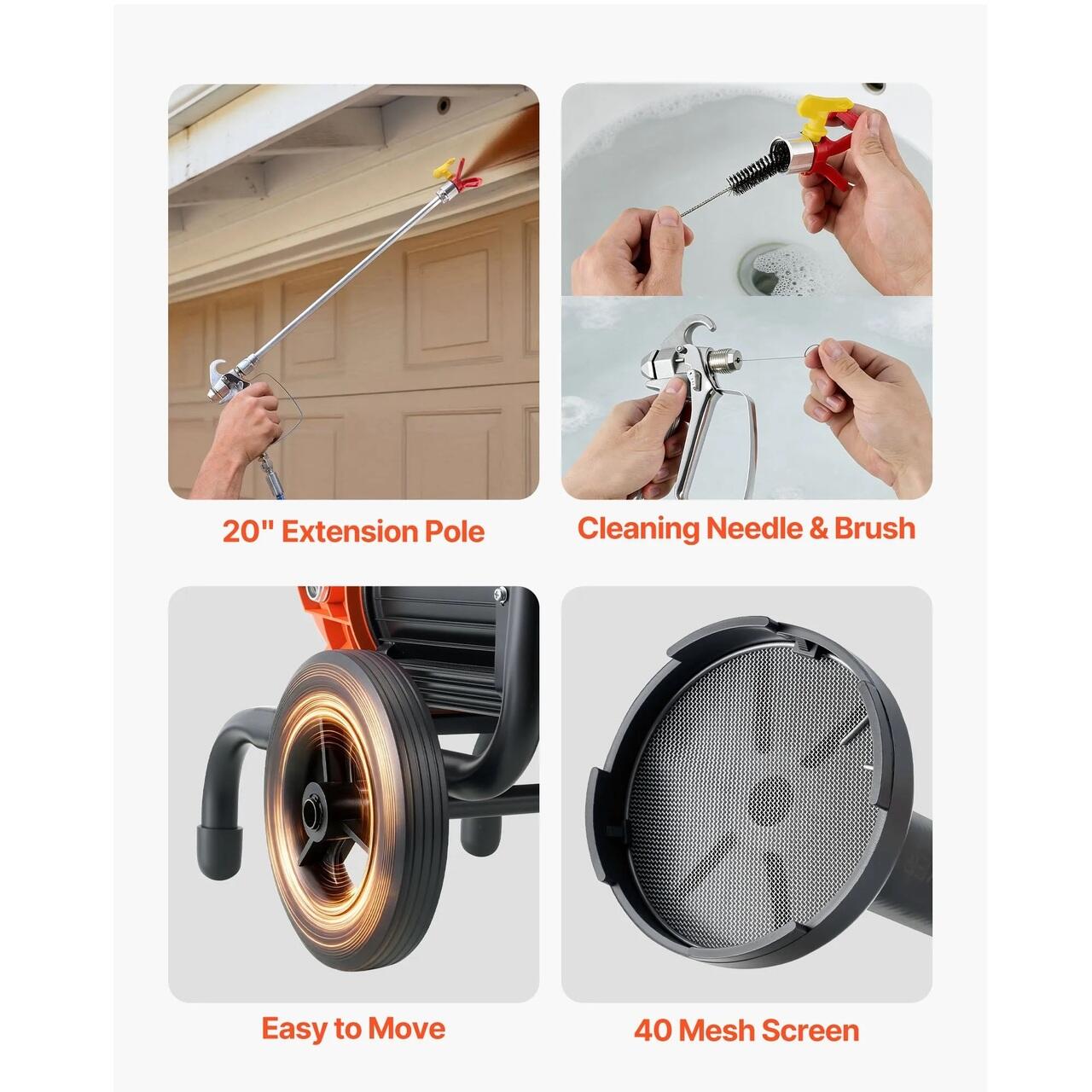 Confortabil de utilizat, usor de curatat: Tija prelungitoare de 50 cm si furtunul de 10 m ajuta la atingerea zonelor inalte fara efort. Pulverizatorul electric de vopsea airless include instrumente de curatare pentru o curatare rapida. Rotile cu rulare lina permit miscarea si repozitionarea usoara.