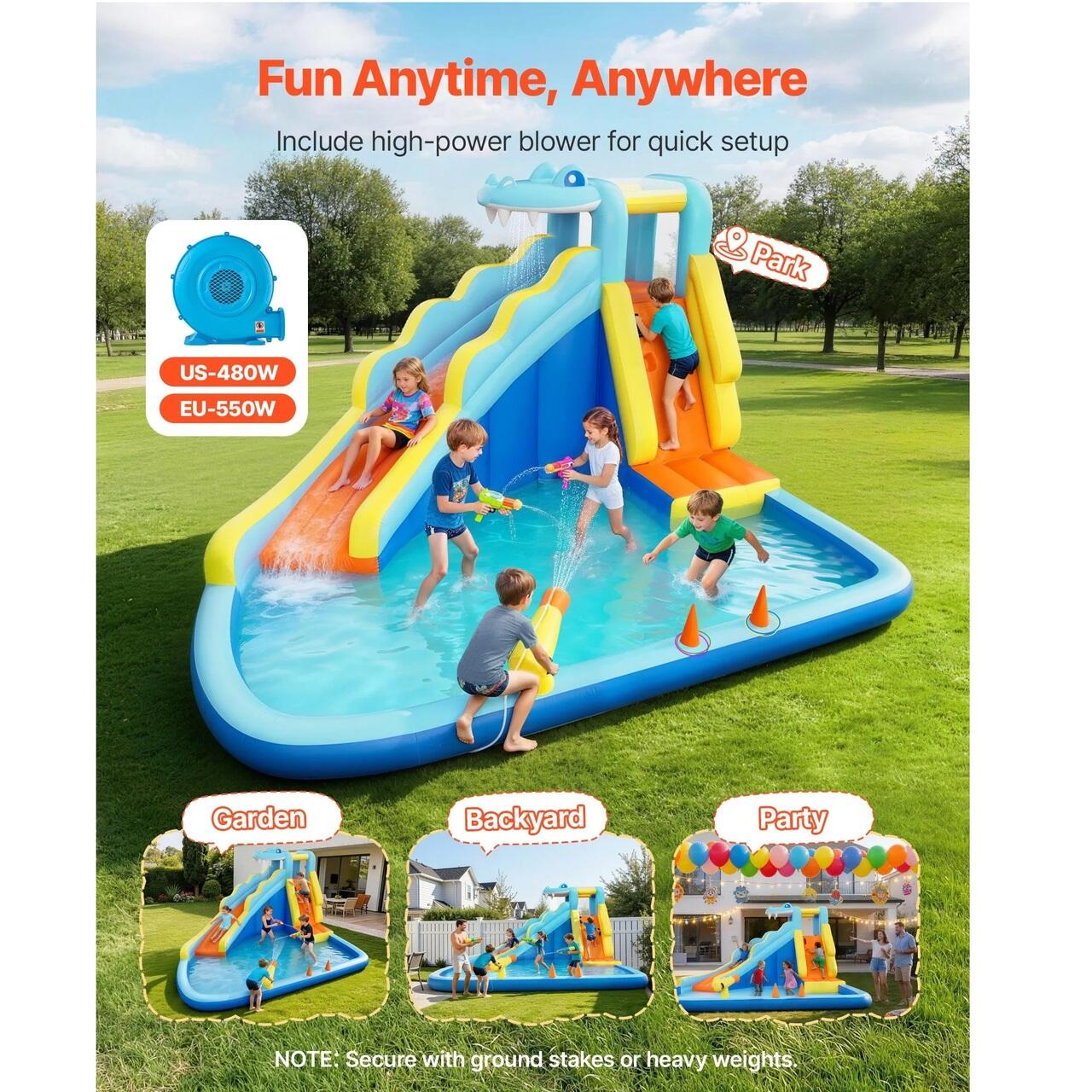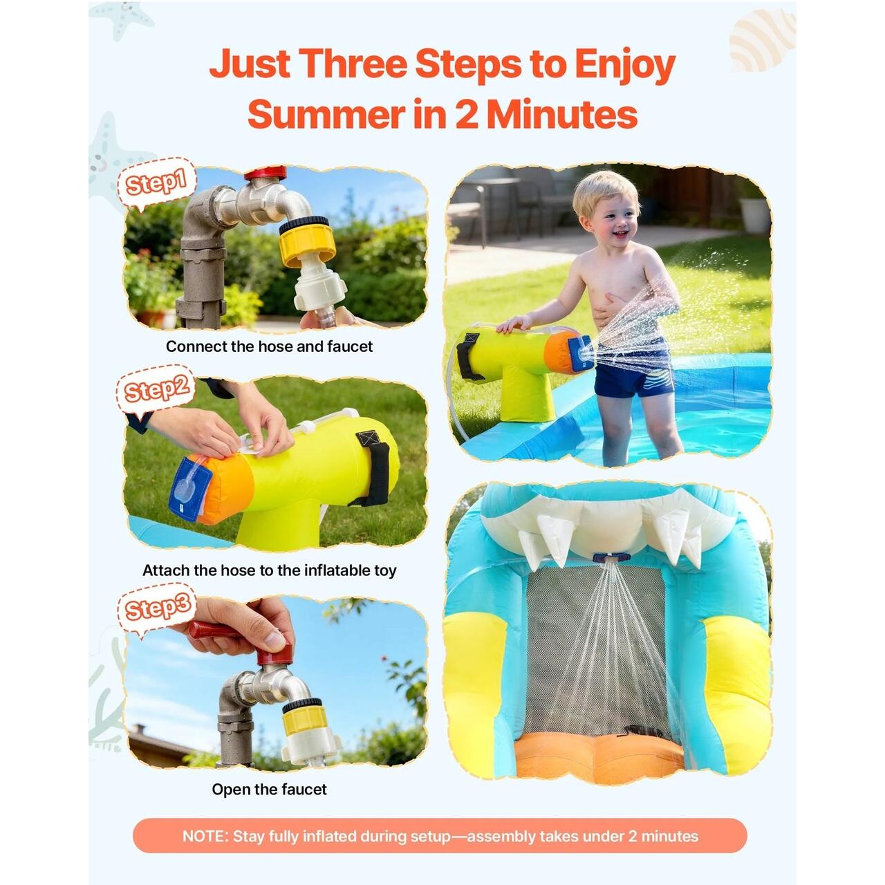 Mai multe moduri de joaca: Proiectat cu o zona de saritura, un tobogan inalt, un tun cu apa si o piscina cu stropi, acest tobogan cu apa umeda si uscata ofera distractie diversa pentru copii si familii. Pistolul cu apa ofera un jet constant de apa rece, mentinand toboganul si piscina pregatite pentru joaca si creand o experienta captivanta de parc acvatic gonflabil.