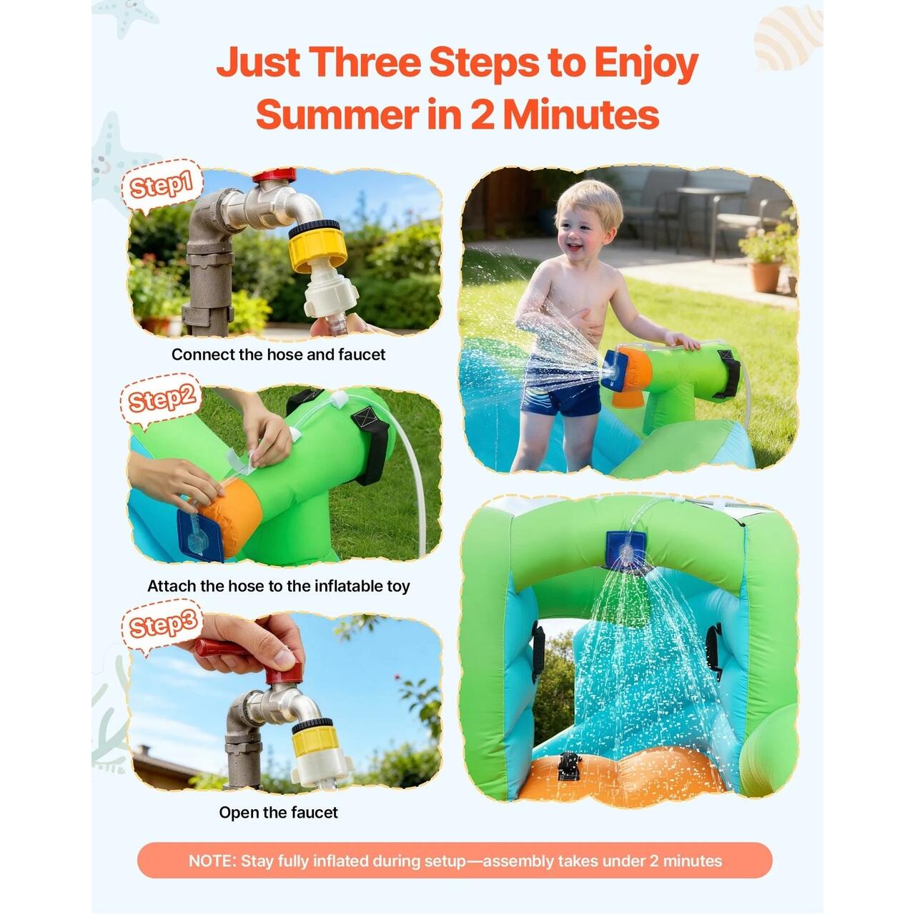 Mai multe moduri de joaca: Proiectat cu o zona larga de sarituri, un cos de baschet si o piscina pentru stropire, acest tobogan gonflabil cu apa umeda si uscata ofera distractie diversa pentru copii si familii. Pistolul cu apa ofera un jet constant de apa rece, mentinand toboganul si piscina pregatite pentru joaca si creand o experienta captivanta de parc acvatic gonflabil.