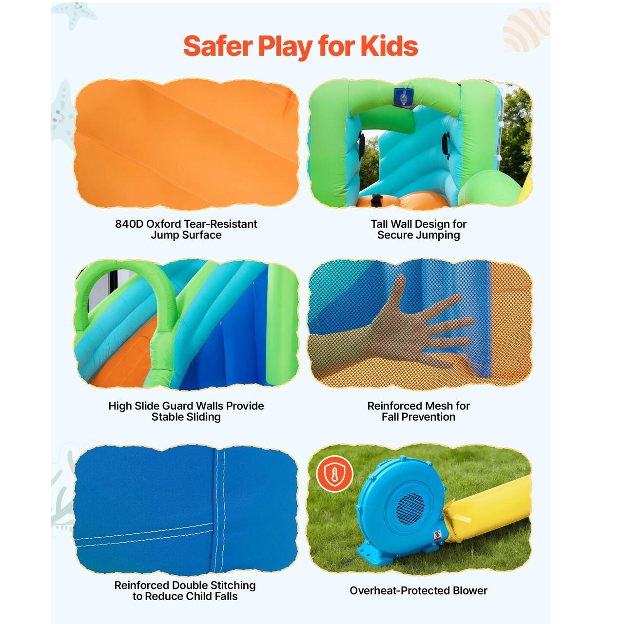 Design cu structura solida: Acest parc gonflabil cu tobogane acvatice combina captuseala 190T cu material Oxford gros 840D+420D pentru a sustine o forma robusta. Cusaturile duble intarite imbunatatesc performanta cusaturilor, in timp ce designul de plasa perimetrala permite o ventilatie puternica si o izolare laterala. Certificare CPC inclusa.