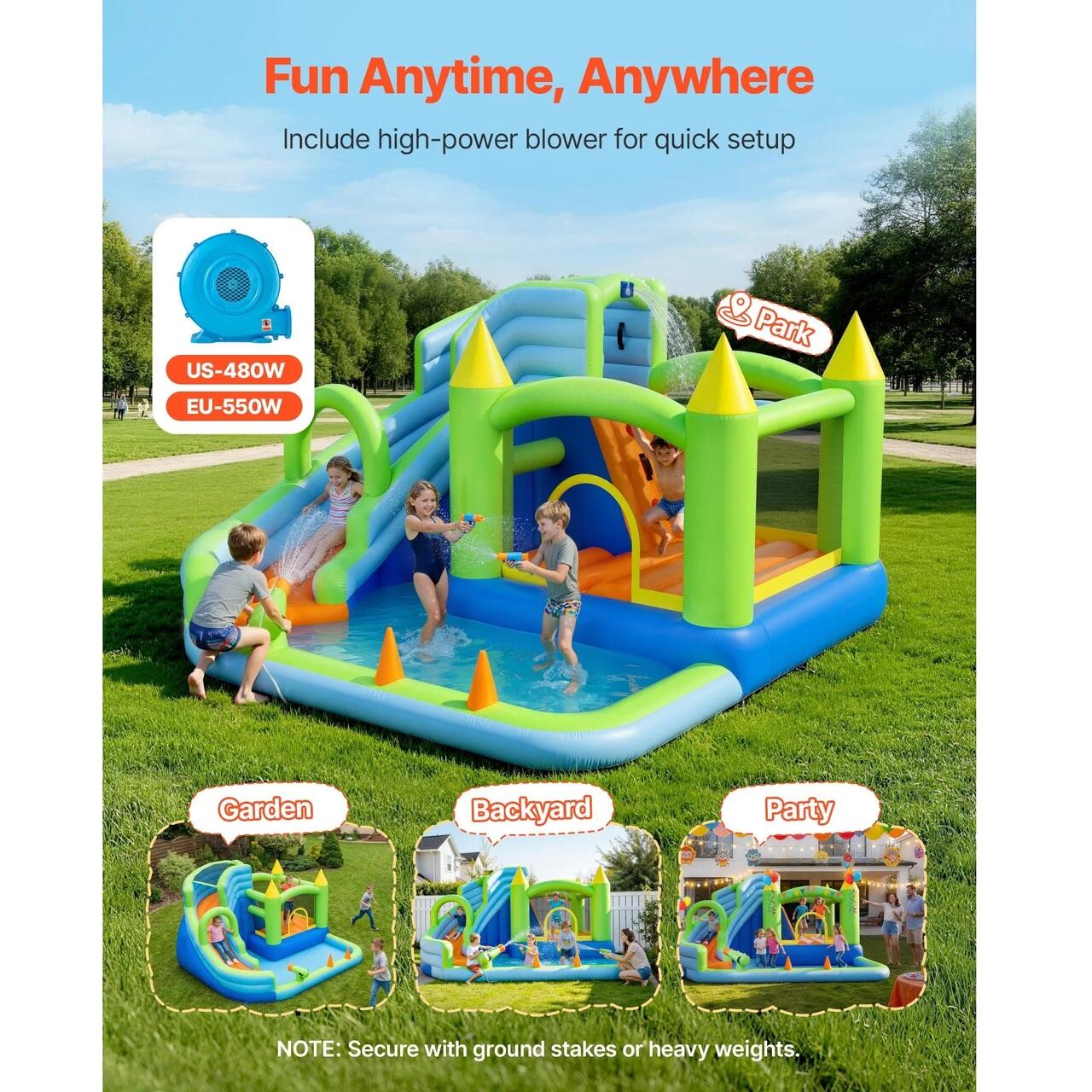 Usor de mutat: Aceasta casa gonflabila vine cu o geanta cu maner pentru transport convenabil. Instalarea si demontarea sunt simple, umflarea completa in mai putin de doua minute. Include fixarea cataramelor care fixeaza orificiul de evacuare a aerului. Va rugam sa verificati solul pentru obiecte ascutite inainte de a o aseza.