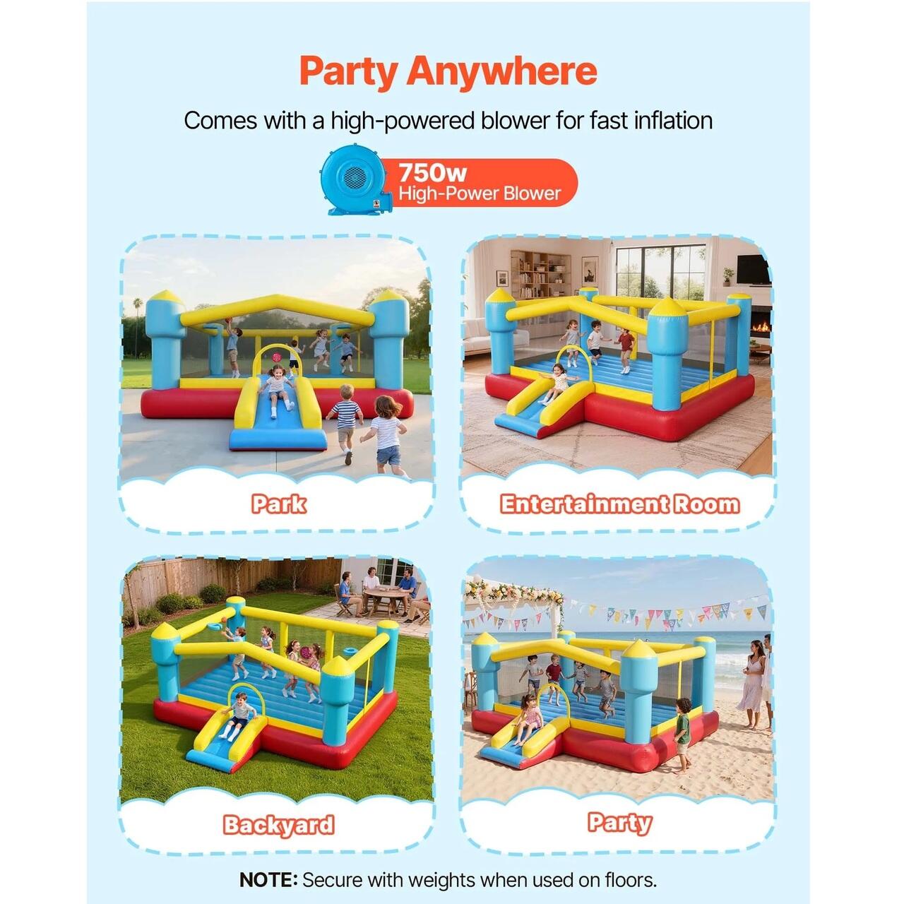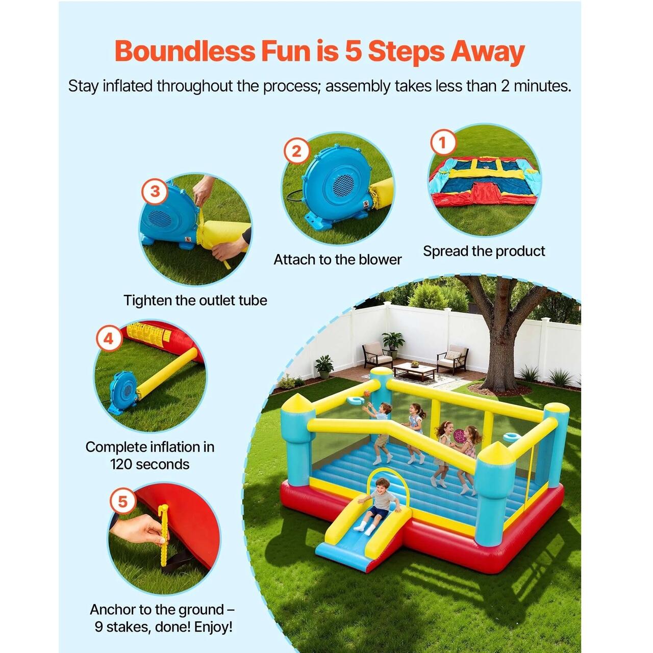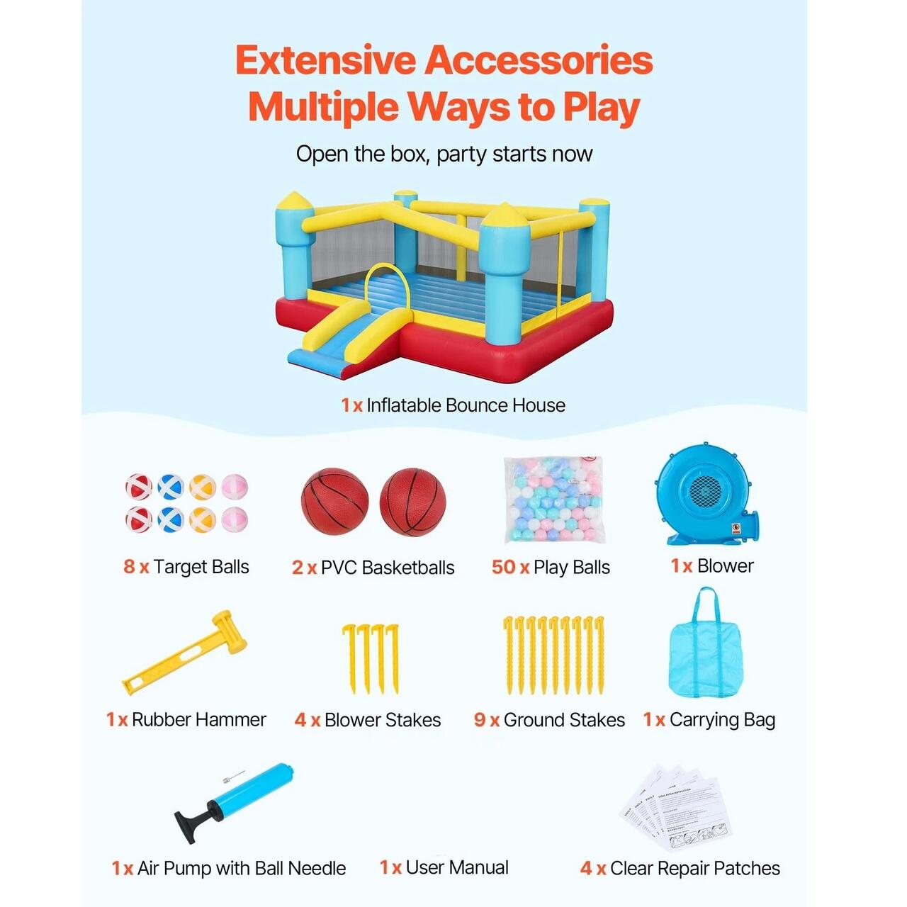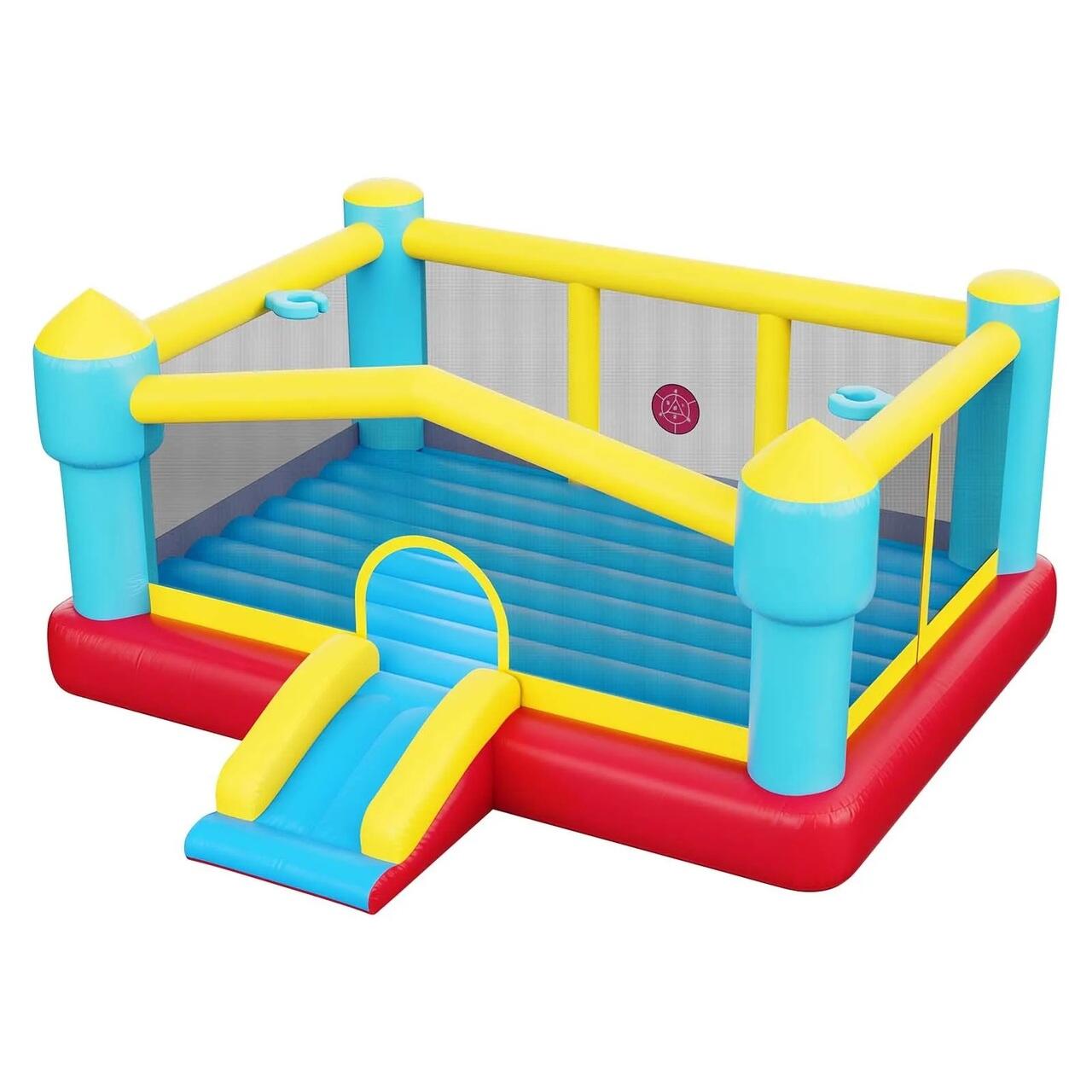 Construit pentru joaca: Proiectat cu o zona mare de saritura si un tobogan, castelul nostru gonflabil ofera diverse activitati pentru copii si familii, de care se pot bucura impreuna. O tinta gratuita adauga un joc interactiv de aruncare pentru joaca in grup. Pachetul include 8 mingi tinta, 2 mingi de baschet din PVC si 50 de mingi de joaca.