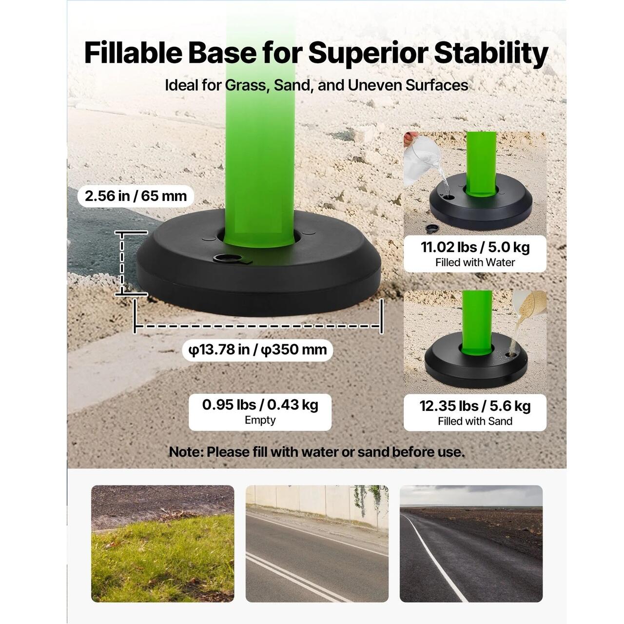 Instalare rapida: Baza este conceputa pentru a fi umpluta cu apa (5,0 kg) sau nisip (5,6 kg), fiind usoara si usor de transportat de o singura persoana. Pur si simplu umpleti baza pentru greutate suplimentara, evitand rasturnarea in conditii de vant.
