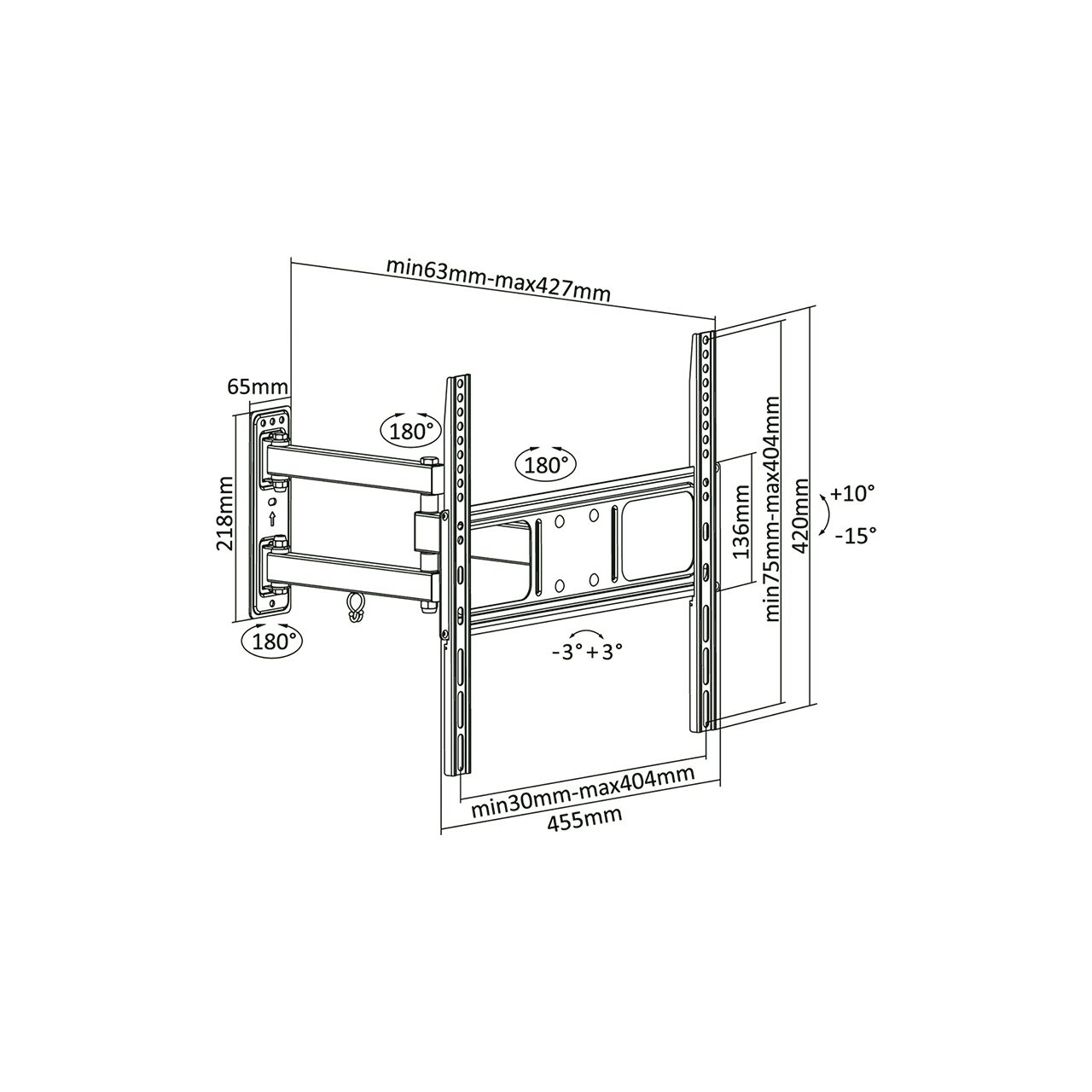 Suport cu montare pe perete pentru TV LCD / plasmã Greutate maxima suportata: 35 kg STANDARD VESA 100x100, 200x100, 200x200, 300x300, 400x200, 400x400 max. Distanta de la perete: 63 - 427mm Reglare unghi inclinare in plan vertical: + 10 / - 15 grade.