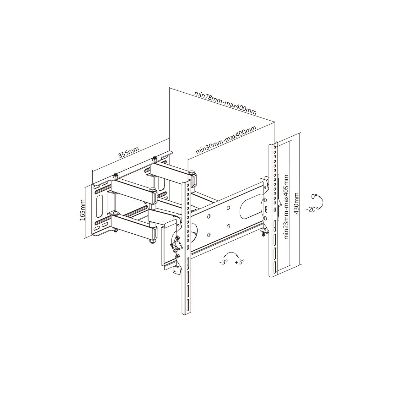 Suport universal pentru LED TV curbat, cu diagonala cuprinsa intre 32-55 inch. Srandard VESA: 75 x 75, 100 x 100, 100 x 150, 150 x 100, 150 x 150, 200 x 100, 100 x 200, 200 x 200, 300 x 200, 300 x 300, 400 x 200, 400 x 300, 400 x 400 Reglare pe verticală 0 / 20 grade. Reglare pe orizontala:+/- 3 grade Distanta de la TV la perete: 78 - 400 mm