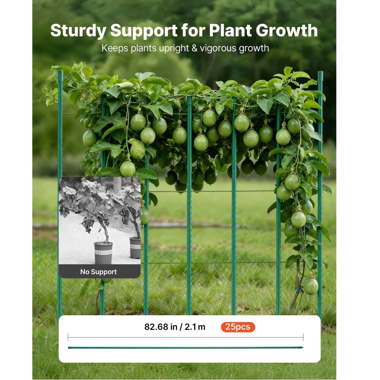 Suport robust pentru plante: Acest set de tarusi de gradina cu lungimea de 213 cm si diametrul de 1 cm include 25 de tarusi care sustin plante precum rosii, fasole si vita de vie. Pentru o rezistenta sporita, se recomanda o configuratie piramidala pentru a rezista rasturnarii si a promova cresterea verticala.
