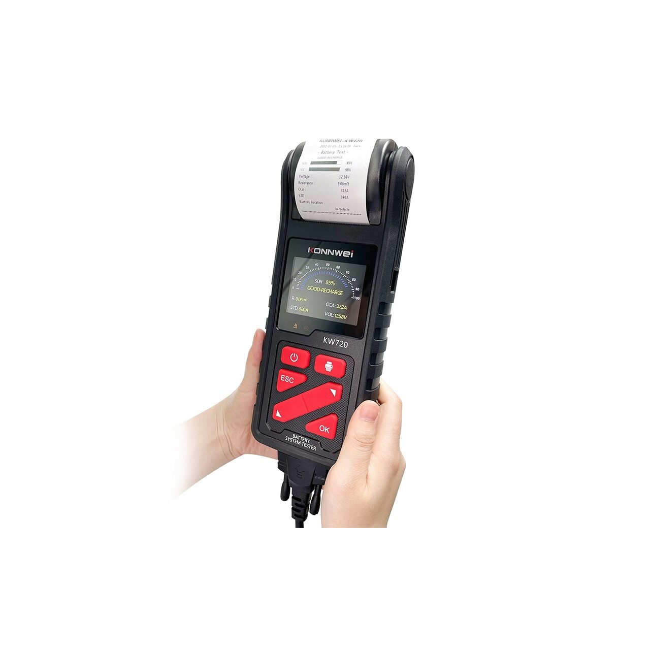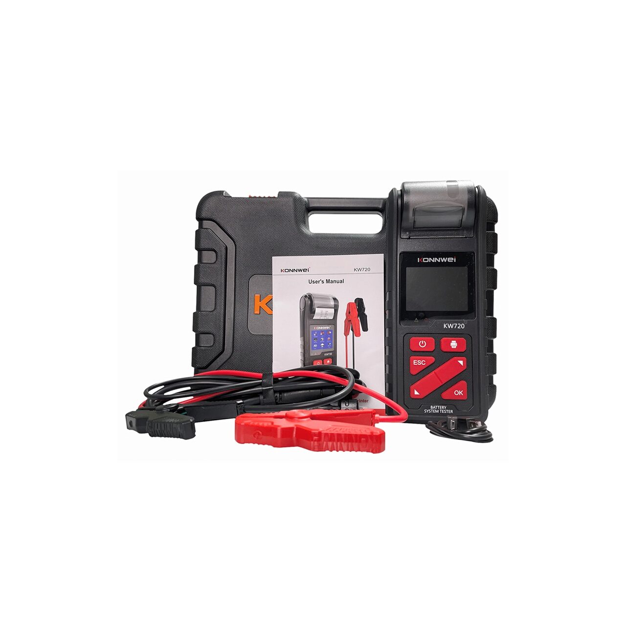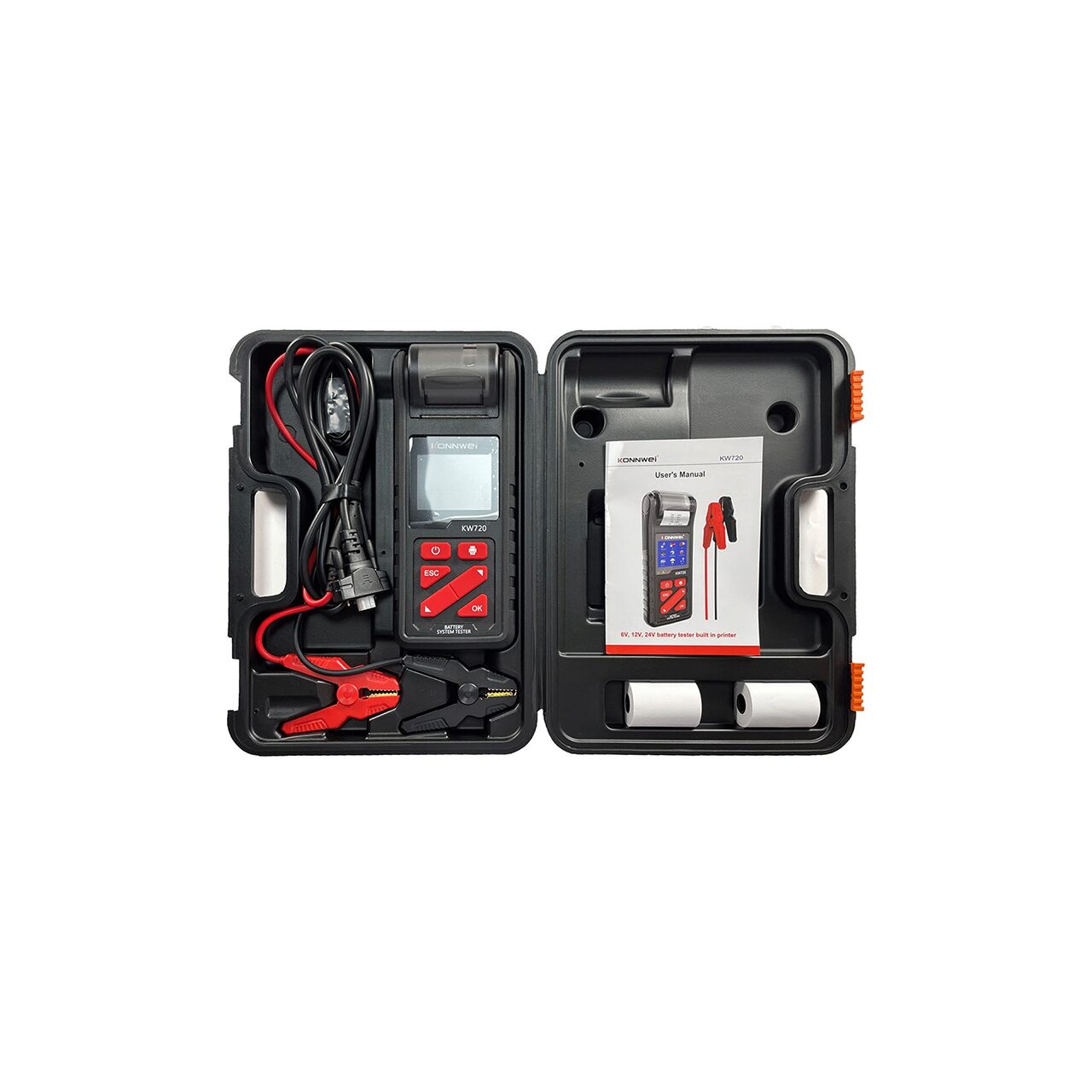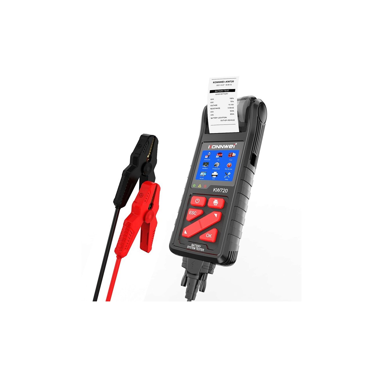 Testerul de baterie KONNWEI KW720 poate verifica starea generală de funcționare a bateriei de 6V 12V 24V. Testarea bateriei poate analiza starea de sănătate a bateriei pentru a calcula capacitatea reală de pornire la rece a bateriei și gradul de îmbătrânire. Testul de pornire vă ajută să testați și să analizați motorul de pornire, iar testul de încărcare este de a verifica starea sistemului de încărcare pentru a evita deteriorarea bateriei. Testerul de baterie KONNWEI KW720 are imprimantă încorporată, echipată cu hârtie standard pentru imprimantă termică, poate imprima direct rezultatul ultimului test După finalizarea testului, puteți imprima cu ușurință rezultatele testului, apoi le puteți lipi pe fisa de lucru. COmpatibil cu majoritatea standardelor pentru bateriile vehiculelor, cum ar fi CCA, BCI, CA, MCA, JIS, DIN, IEC/EN/SAE Potrivit pentru toate bateriile cu plumb-acid de 1V -30V, de la 100 la 2000 CCA, inclusiv inundate obișnuite, AGM plat placă, spirală AGM, baterii GEL și EFB pentru camion, barcă, mașină, motociclete, mașini de tuns iarba și alte mașini de grădinărit, etc. Clemele de aligator complet izolate sunt construite ținând cont de siguranța utilizatorului prin funcționare fără scântei și protecție împotriva polarității inverse. Acest tester de baterii auto este ușor de utilizat și poate obține rezultate precise în câteva secunde.