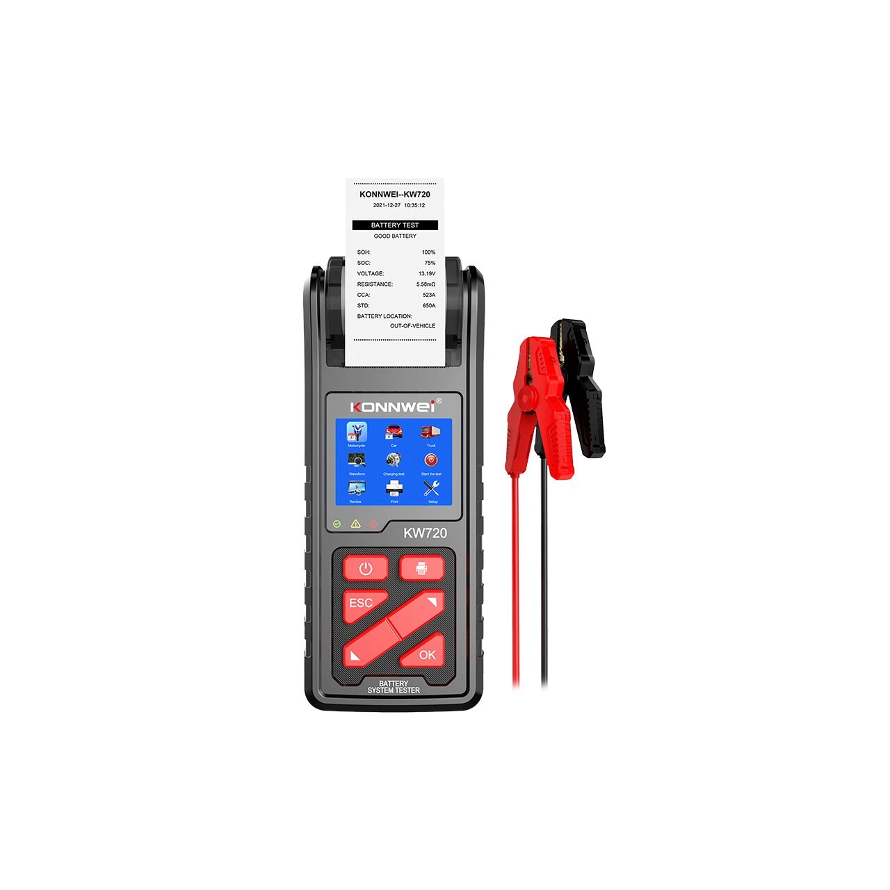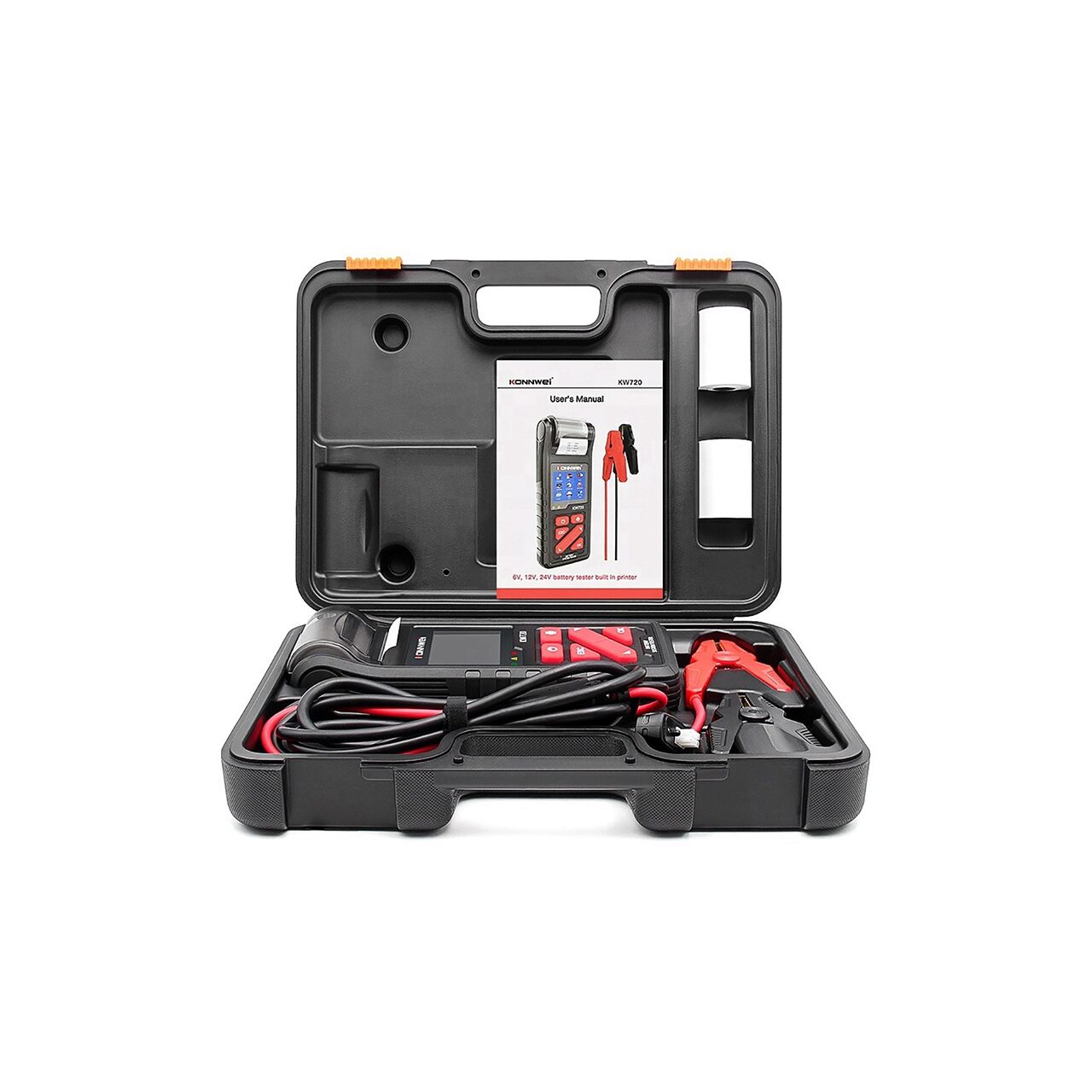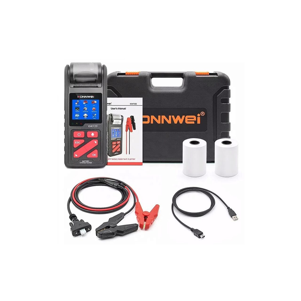 Testerul de baterie KONNWEI KW720 poate verifica starea generală de funcționare a bateriei de 6V 12V 24V. Testarea bateriei poate analiza starea de sănătate a bateriei pentru a calcula capacitatea reală de pornire la rece a bateriei și gradul de îmbătrânire. Testul de pornire vă ajută să testați și să analizați motorul de pornire, iar testul de încărcare este de a verifica starea sistemului de încărcare pentru a evita deteriorarea bateriei. Testerul de baterie KONNWEI KW720 are imprimantă încorporată, echipată cu hârtie standard pentru imprimantă termică, poate imprima direct rezultatul ultimului test După finalizarea testului, puteți imprima cu ușurință rezultatele testului, apoi le puteți lipi pe fisa de lucru. COmpatibil cu majoritatea standardelor pentru bateriile vehiculelor, cum ar fi CCA, BCI, CA, MCA, JIS, DIN, IEC/EN/SAE Potrivit pentru toate bateriile cu plumb-acid de 1V -30V, de la 100 la 2000 CCA, inclusiv inundate obișnuite, AGM plat placă, spirală AGM, baterii GEL și EFB pentru camion, barcă, mașină, motociclete, mașini de tuns iarba și alte mașini de grădinărit, etc. Clemele de aligator complet izolate sunt construite ținând cont de siguranța utilizatorului prin funcționare fără scântei și protecție împotriva polarității inverse. Acest tester de baterii auto este ușor de utilizat și poate obține rezultate precise în câteva secunde.