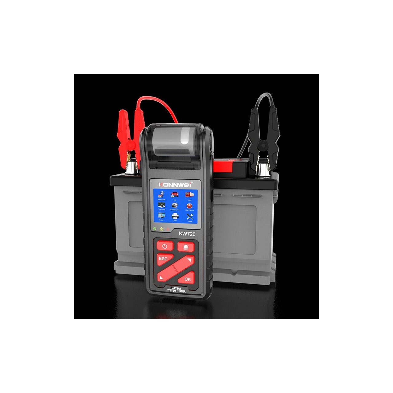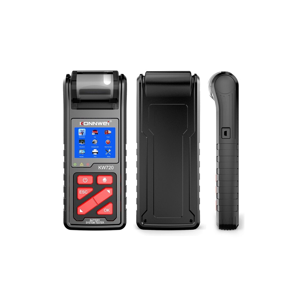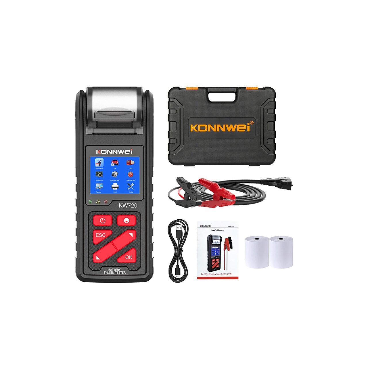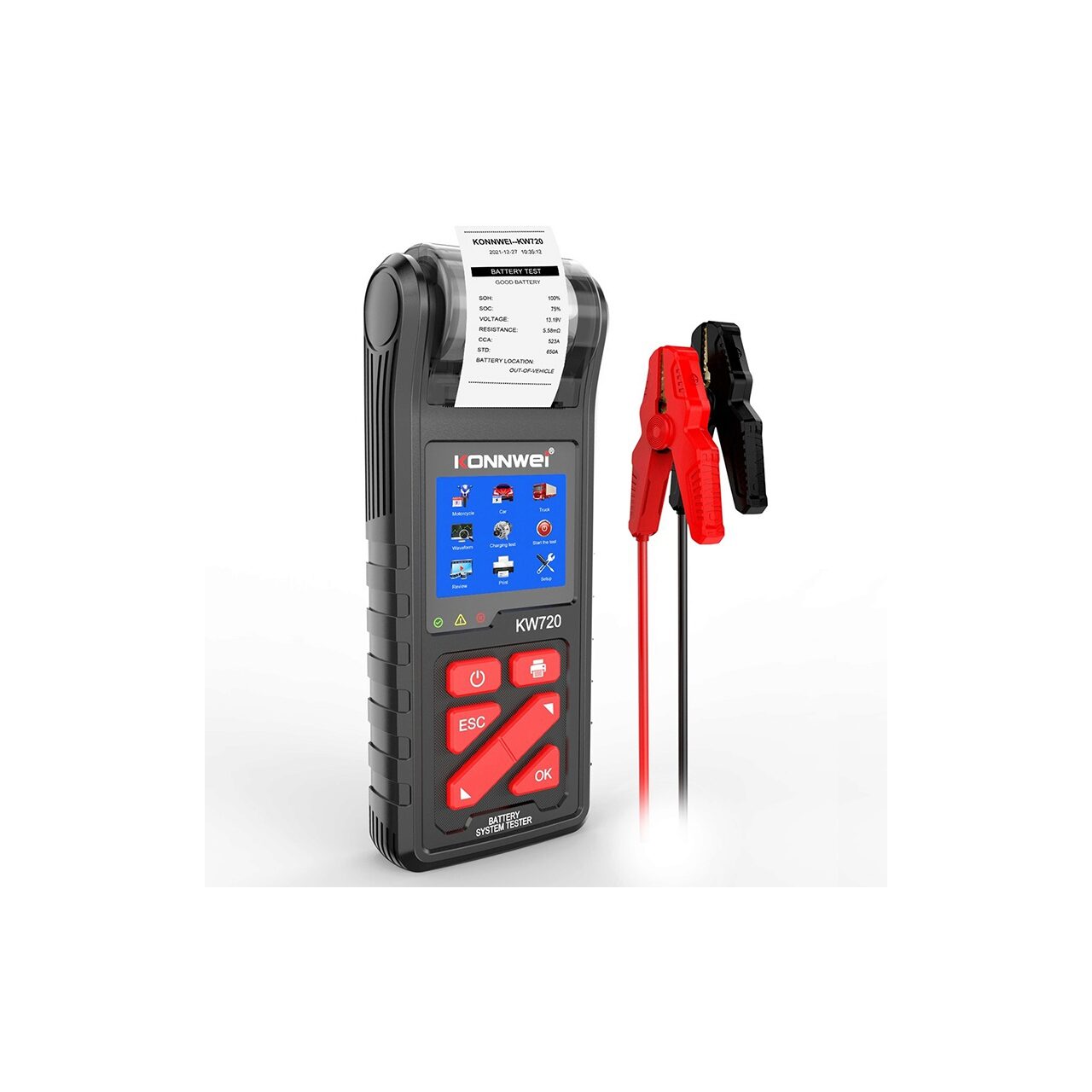 Testerul de baterie KONNWEI KW720 poate verifica starea generală de funcționare a bateriei de 6V 12V 24V. Testarea bateriei poate analiza starea de sănătate a bateriei pentru a calcula capacitatea reală de pornire la rece a bateriei și gradul de îmbătrânire. Testul de pornire vă ajută să testați și să analizați motorul de pornire, iar testul de încărcare este de a verifica starea sistemului de încărcare pentru a evita deteriorarea bateriei. Testerul de baterie KONNWEI KW720 are imprimantă încorporată, echipată cu hârtie standard pentru imprimantă termică, poate imprima direct rezultatul ultimului test După finalizarea testului, puteți imprima cu ușurință rezultatele testului, apoi le puteți lipi pe fisa de lucru. COmpatibil cu majoritatea standardelor pentru bateriile vehiculelor, cum ar fi CCA, BCI, CA, MCA, JIS, DIN, IEC/EN/SAE Potrivit pentru toate bateriile cu plumb-acid de 1V -30V, de la 100 la 2000 CCA, inclusiv inundate obișnuite, AGM plat placă, spirală AGM, baterii GEL și EFB pentru camion, barcă, mașină, motociclete, mașini de tuns iarba și alte mașini de grădinărit, etc. Clemele de aligator complet izolate sunt construite ținând cont de siguranța utilizatorului prin funcționare fără scântei și protecție împotriva polarității inverse. Acest tester de baterii auto este ușor de utilizat și poate obține rezultate precise în câteva secunde.