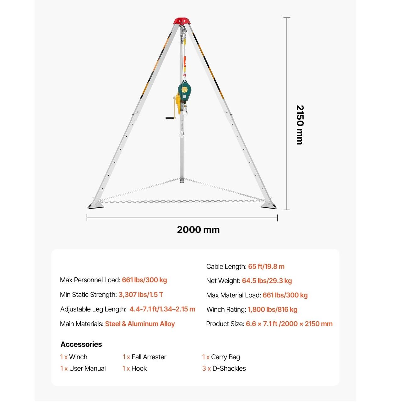 Trepied de salvare si lucru, protectia muncii in canalizari, Capacitate personal 300 kg, Lungime 20 m, Troliu manual, lant anti-rasturnare