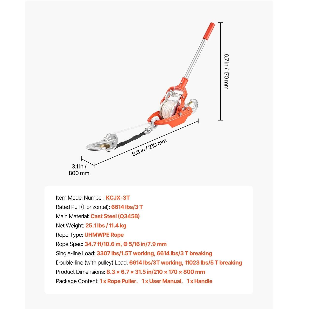 Usor si confortabil de utilizat: Acest tractor de troliu cu cablu are doua carlige din otel forjat cu zavoare de siguranta cu auto-inchidere. Manerul antiderapant din PVC de 45 cm adauga un efect de levier si va mentine mainile confortabile la trageri lungi.