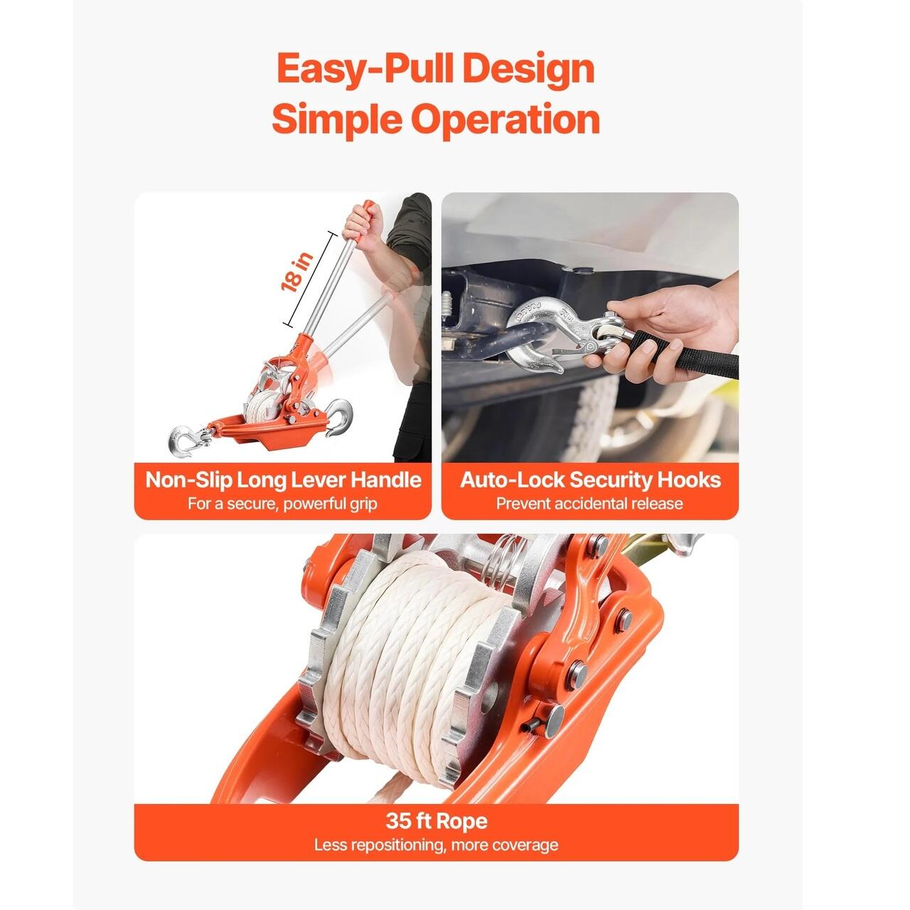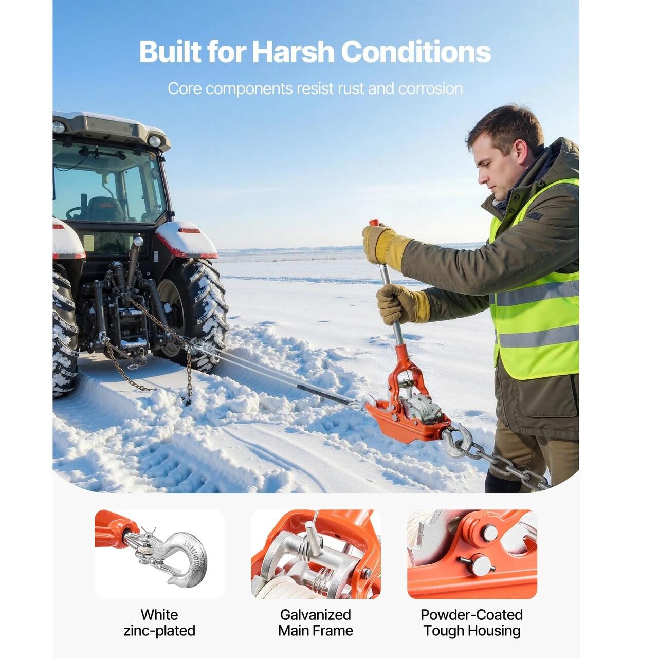 Rezistent la rugina pentru utilizare in exterior: Acest extractor cu clichet este placat cu zinc alb si are un finisaj vopsit in camp electrostatic. Piesele metalice protejate ajuta la rezistenta la umezeala si uzura, facand munca in aer liber mai usoara. Pregatit pentru multe scenarii: Acest extractor cu clichet functioneaza excelent pentru curatenia curtii, recuperarea pe teren accidentat, mutarea echipamentelor agricole si tractarea pe santier. Designul versatil face ca sarcinile dificile sa fie mai usoare si mai line.