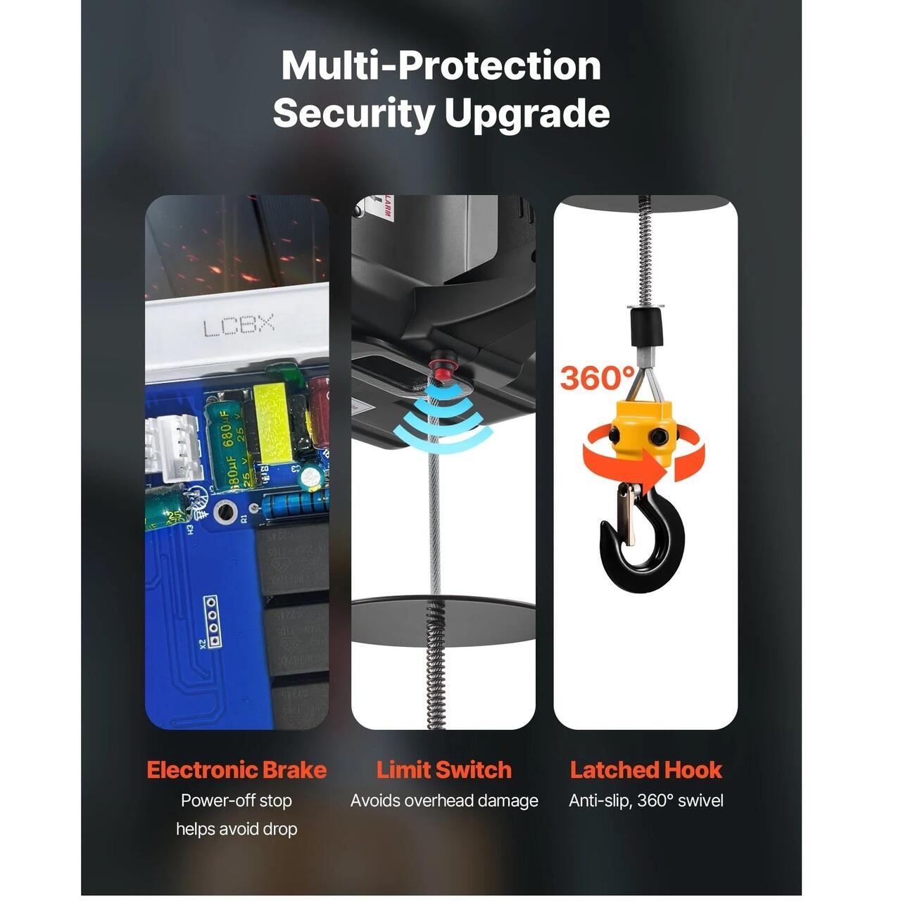 Protectie de securitate multistrat: Acest troliu electric combina frane electronice si mecanice pentru o oprire sigura. Un comutator de limita si un carlig de blocare la 360° adauga siguranta, iar motorul se opreste automat la pierderea de putere sau la limita superioara pentru a evita caderile.