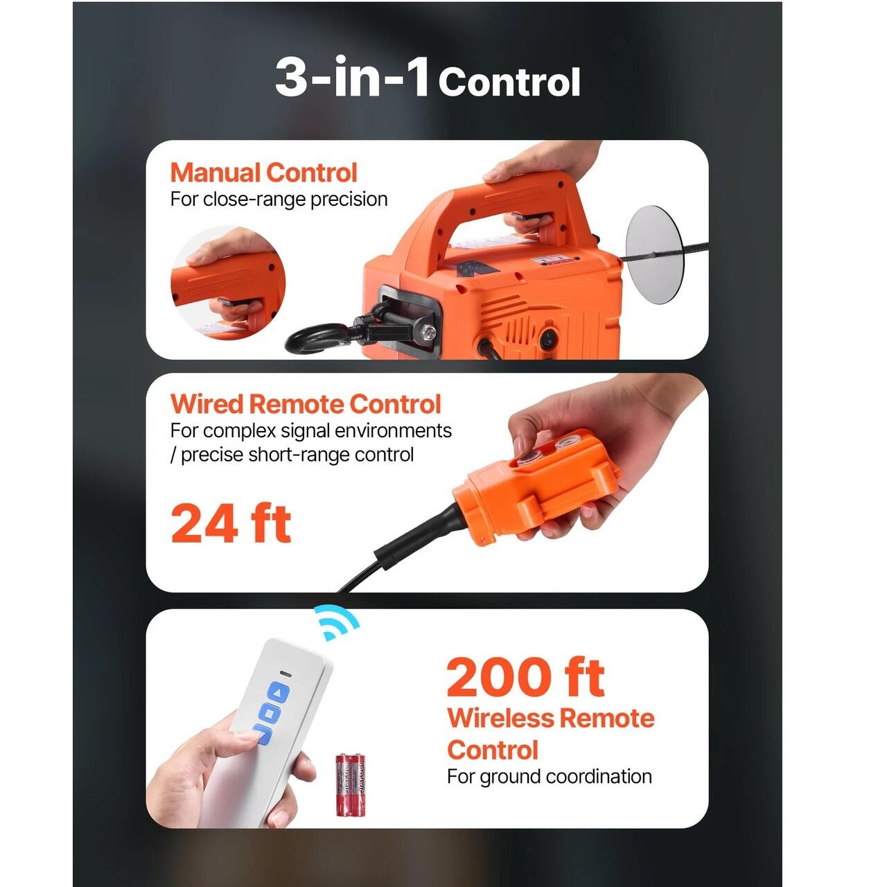 Control usor 3 in 1: Acest palan electric abordeaza ridicari verticale si tractiuni orizontale intr-o singura unitate. Butoanele manerului raspund rapid, telecomanda cu fir de 7,1 m ofera un control precis, iar telecomanda wireless de 60 m sustine munca in echipa mobila.