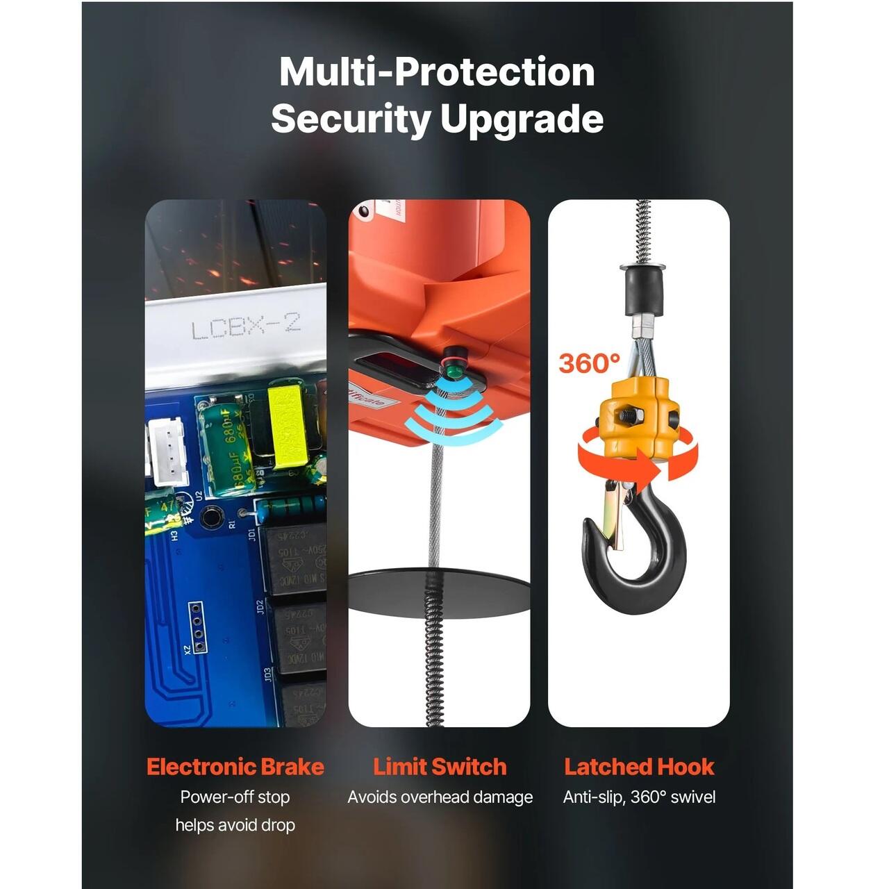 Protectie de securitate multistrat: Acest troliu electric combina frane electronice si mecanice pentru o oprire sigura. Un comutator de limita si un carlig de blocare la 360° adauga siguranta, iar motorul se opreste automat la pierderea de putere sau la limita superioara pentru a evita caderile.