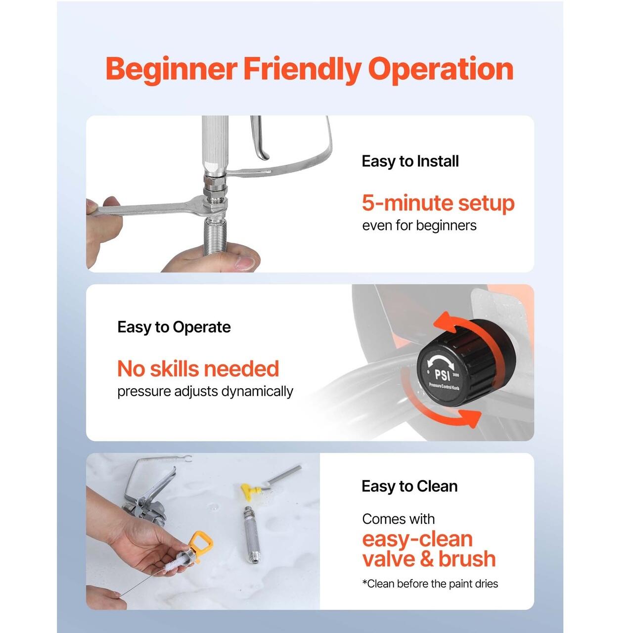 Durabil si fiabil: Pulverizatorul nostru airless de inalta presiune dispune de un motor reglabil, furtun profesional de cauciuc si cadru complet metalic pentru a minimiza defectiunile si a asigura performante fiabile, mentinand proiectele dvs. in desfasurare fara probleme de la inceput pana la sfarsit.