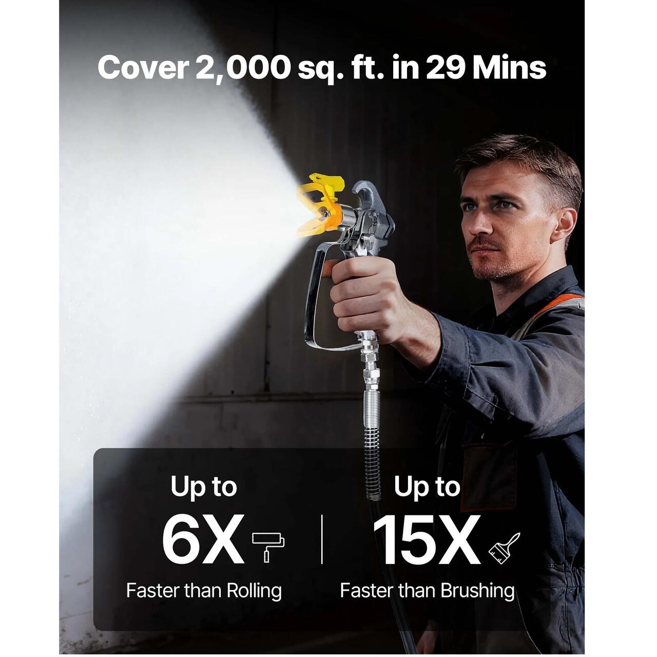 Acoperire eficienta: Motorul de 900 W, debitul de 0,47 GPM si presiunea de 3300 PSI ofera viteze de pulverizare de 6 ori mai mari decat rolele si de 15 ori mai mari decat pensulele. Pulverizatorul nostru de vopsea airless cu suport este ideal pentru proiecte de amploare, cum ar fi case insiruite si cladiri industriale.