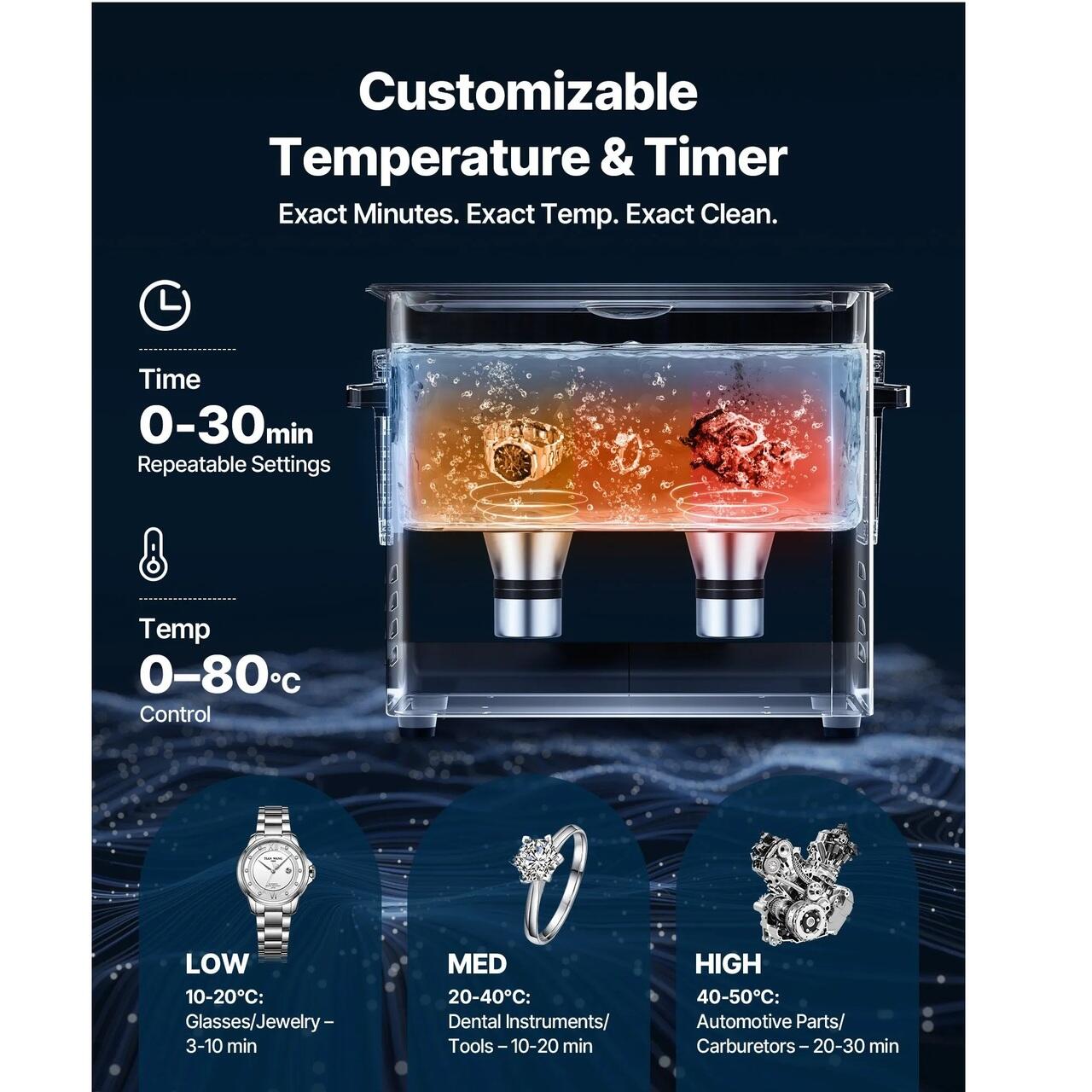 Potrivit pentru mai multe materiale: Ideal pentru bijuterii, ceasuri/componente electronice sau piese industriale cu pete puternice de ulei. Temperaturile de curatare reglabile de la 0 la 80°C accelereaza dizolvarea murdariei, oferind o curatare mai eficienta si mai precisa.