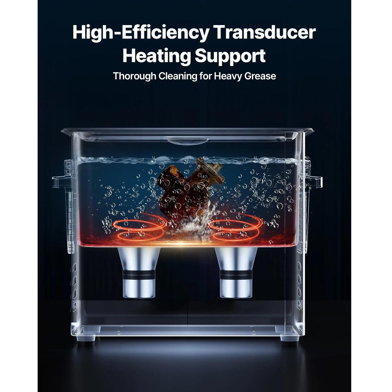 Tehnologie avansata a traductoarelor: Echipat cu traductoare de inalta eficienta, aparatul nostru de curatare cu ultrasunete ofera o putere de curatare exploziva care descompune grasimea si murdaria persistenta. Ofera o curatare profunda la 360° pentru instrumente de precizie, indepartand murdaria si uleiurile.