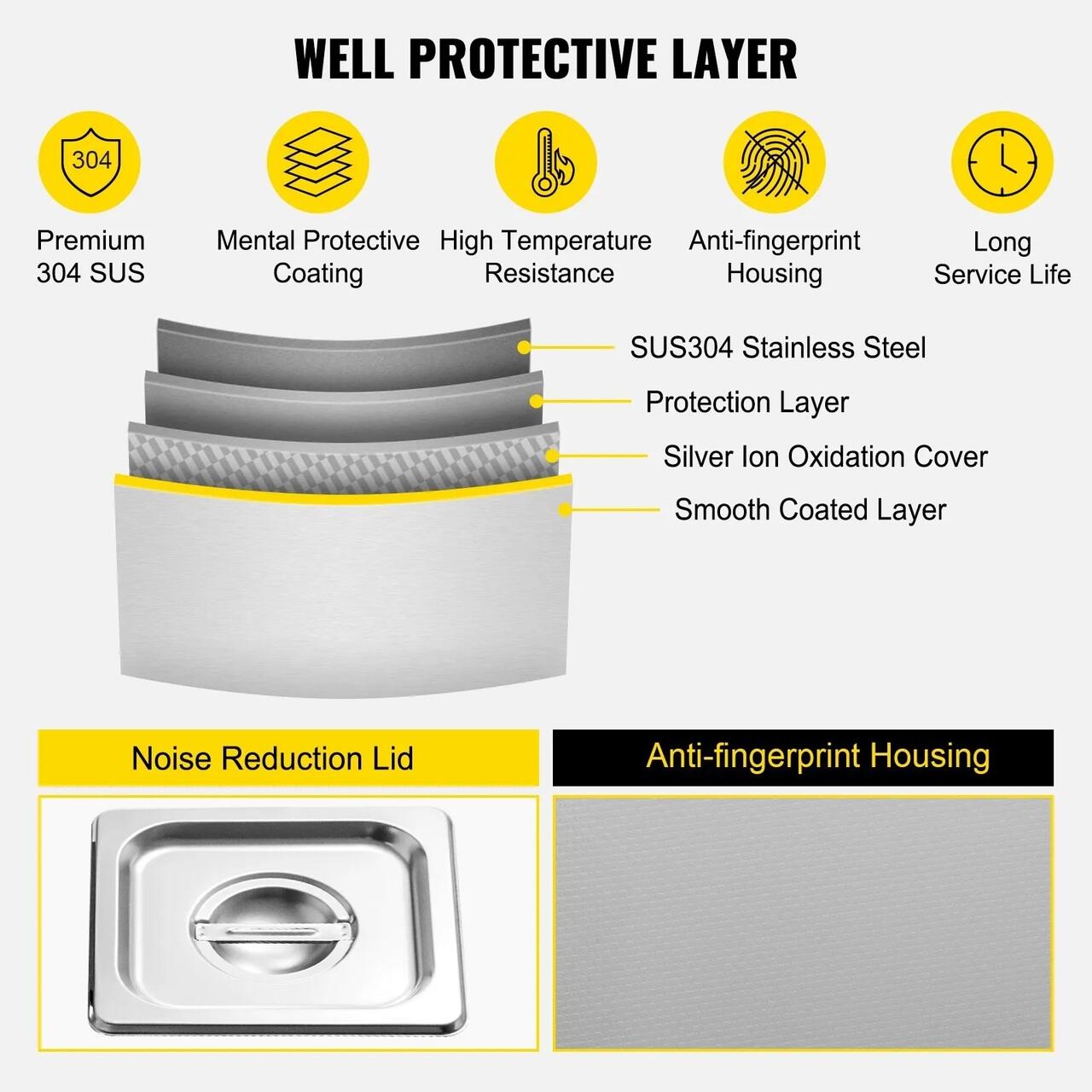 DESIGN USOR DE UTILIZAT- Acest aparat de curatat cu ultrasunete comercial este conceput cu detalii personalizate pentru o utilizare mai buna de catre client. Patru picioare antiderapante din cauciuc asigura stabilitatea aparatului in timpul functionarii. Pentru a preveni supracurentul si supraincalzirea, este prevazuta o dubla protectie impotriva sigurantelor si mai multe orificii de racire.