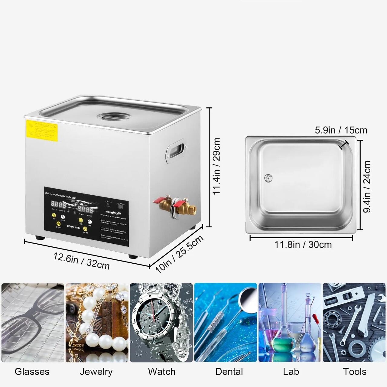 Calitate premium: Capacitate rezervor: 10L; Putere de incalzire: 400W; Putere cu ultrasunete: 240W; Frecventa: 40KHz. Construit din otel inoxidabil 304, rezistent la coroziune si rugina. Design integral, fara scurgeri de apa. Produs excelent pentru curatarea obiectelor, obtinerea rapida a articolelor noi si stralucitoare.